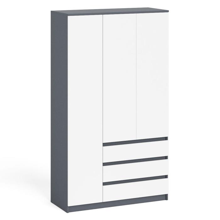Оборудован тремя распашными дверями и тремя выдвижными ящиками. Слева за дверкой расположено отделение с горизонтальной штангой для одежды на плечиках, антресольной полкой и нижней нишей. Справа сверху за дверьми отделение с тремя полками и снизу тремя выдвижными ящиками. Шкаф-комод не универсален при сборке - отделение с ящиками располагается только справа. Продуманная конструкция позволяет убрать лишние предметы, тем самым сохраняя единый стиль оформления помещения. Отсутствие ручек главное преимущество данной модели.