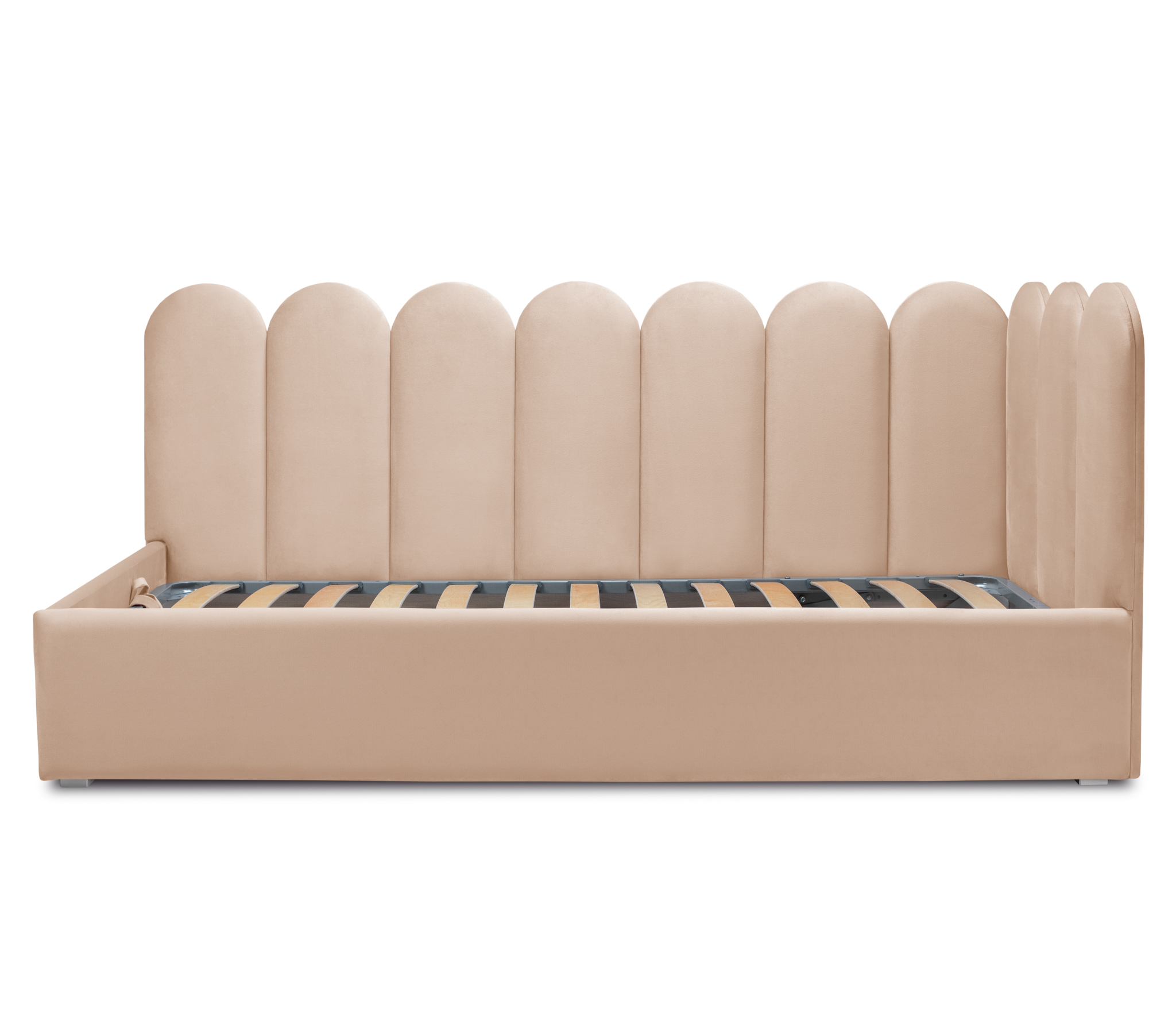 Кровать выполнена из качественного микровелюра, который с легкостью чистится при необходимости.