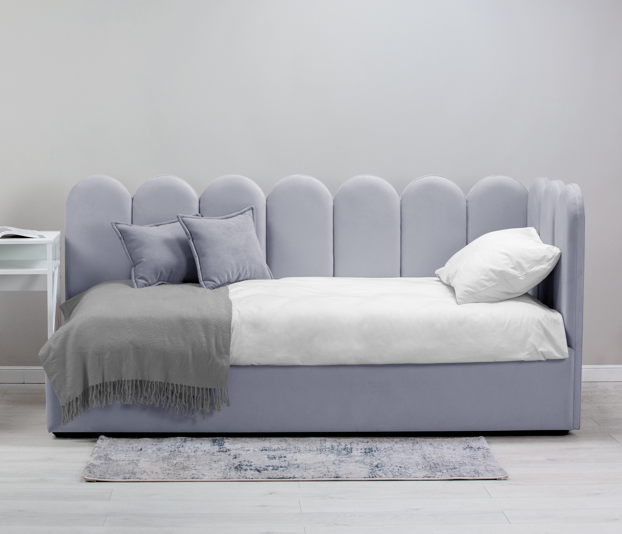 Кровать выполнена из качественного микровелюра, который с легкостью чистится при необходимости.