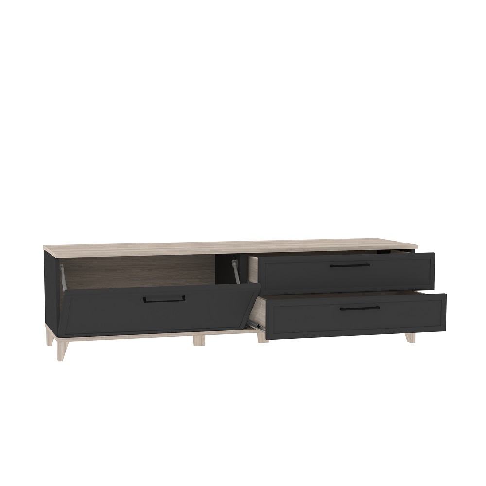 Ни одна современная гостиная не обходится без ТВ-зоны. Тумба под телевизор Аурелио 3 сочетает в себе уникальные черты классической мебели в современном исполнении, а также максимальную функциональность. Модуль имеет 2 выкатных ящика на направляющих плавного выдвижения и откидную створку, за которой скрывается закрытая ниша.