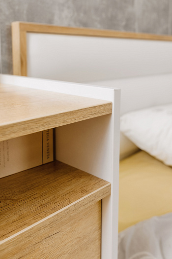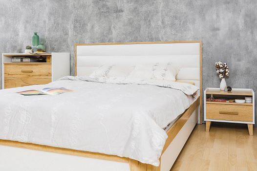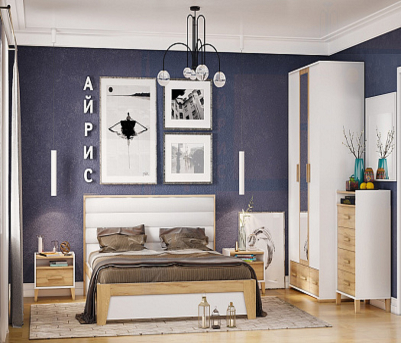 Светлая и теплая модульная коллекция Айрис выполнена в скандинавском стиле в декоре белый/дуб золотистый. Оптимальное сочетание белого цвета с древесной текстурой наполнит пространство уютом и украсит интерьер Вашей современной спальни. Мебель изготовлена из высококлассного ЛДСП класса эмиссии Е1, что гарантирует безопасность в процессе ежедневной эксплуатации. А кромка ПВХ по периметру изделий защитит их от деформации и продлит срок службы. Разноплановые модули позволят Вам без труда собрать идеальный комплект и рационально организовать пространство спальни. Например, комплект 1 состоит из двуспальной кровати 140х200, двух компактных прикроватных тумб, трехстворчатого шкафа с зеркалом и высокого комода. Зеркало в комплект не входит.