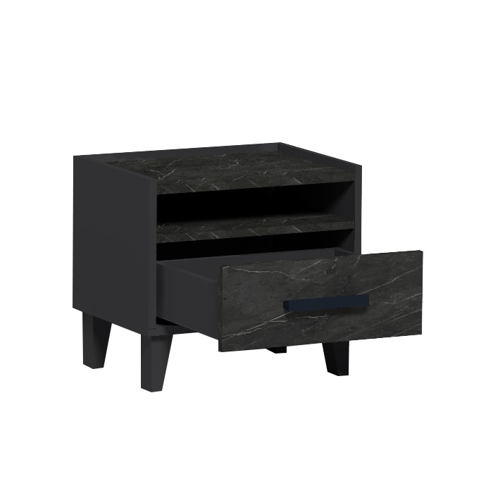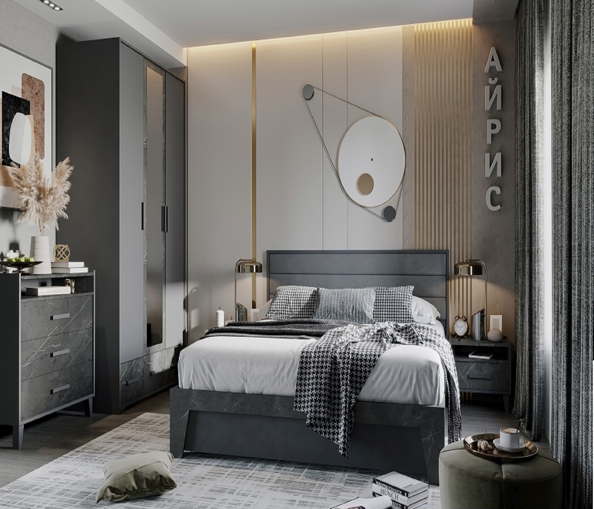 Оригинальный глубокий декор "антрацит/креатель" модульной коллекции Айрис не оставит равнодушными ценителей стильной и качественной мебели. Комплект 4 состоит из двуспальной кровати, двух прикроватных тумб, вместительного шкафа для одежды и белья с зеркалом и комода с ящиками.