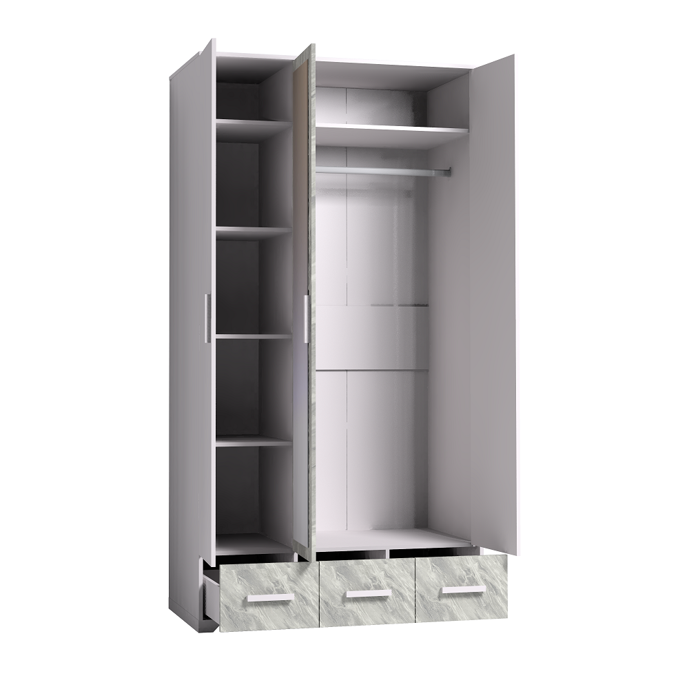 Трехдверный шкаф из коллекции Айрис - лучшее решение для организации хранения в малогабаритной спальне. Сделав выбор в пользу данной модели, Вам не придется докупать дополнительно комод или тумбу: разноплановое наполнение позволит разместить все вещи, от деликатной одежды на плечиках до белья и аксессуаров. Модель оснащена вместительной продольной штангой, комплектом полок и 3-мя ящиками полного выдвижения для максимальной вместимости. Зеркало на центральном фасаде визуально облегчает конструкцию шкафа и добавляет ему функциональности. Для максимальной безопасности крепится к стене за подвесы.