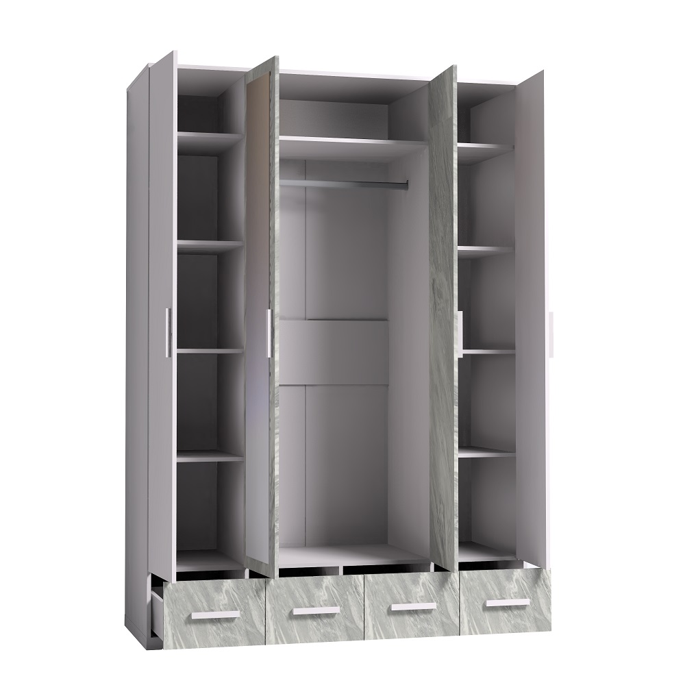Хотите грамотно обустроить хранение в спальне? Вместительный четырехдверный шкаф из коллекции Айрис решит эту задачу. Продуманное до мелочей наполнение шкафа позволит Вам зонировать хранение одежды всех членов Вашей семьи. По бокам модуля имеется комплект полок для вещей в сложенном виде, центральная секция оснащена продольной штангой для деликатной одежды на плечиках и длинной полкой для коробок. Максимальная нагрузка на штангу - 40 кг. В четырех выкатных ящиках на шариковых направляющих плавного и бесшумного выдвижения хватит места для постельных принадлежностей, текстиля, белья и аксессуаров. Модуль крепится на стену за подвесы.