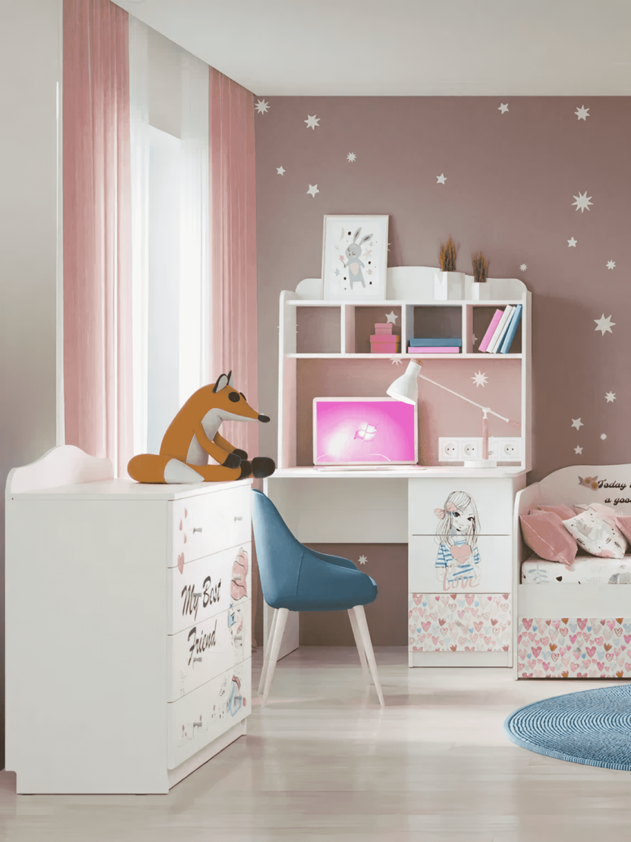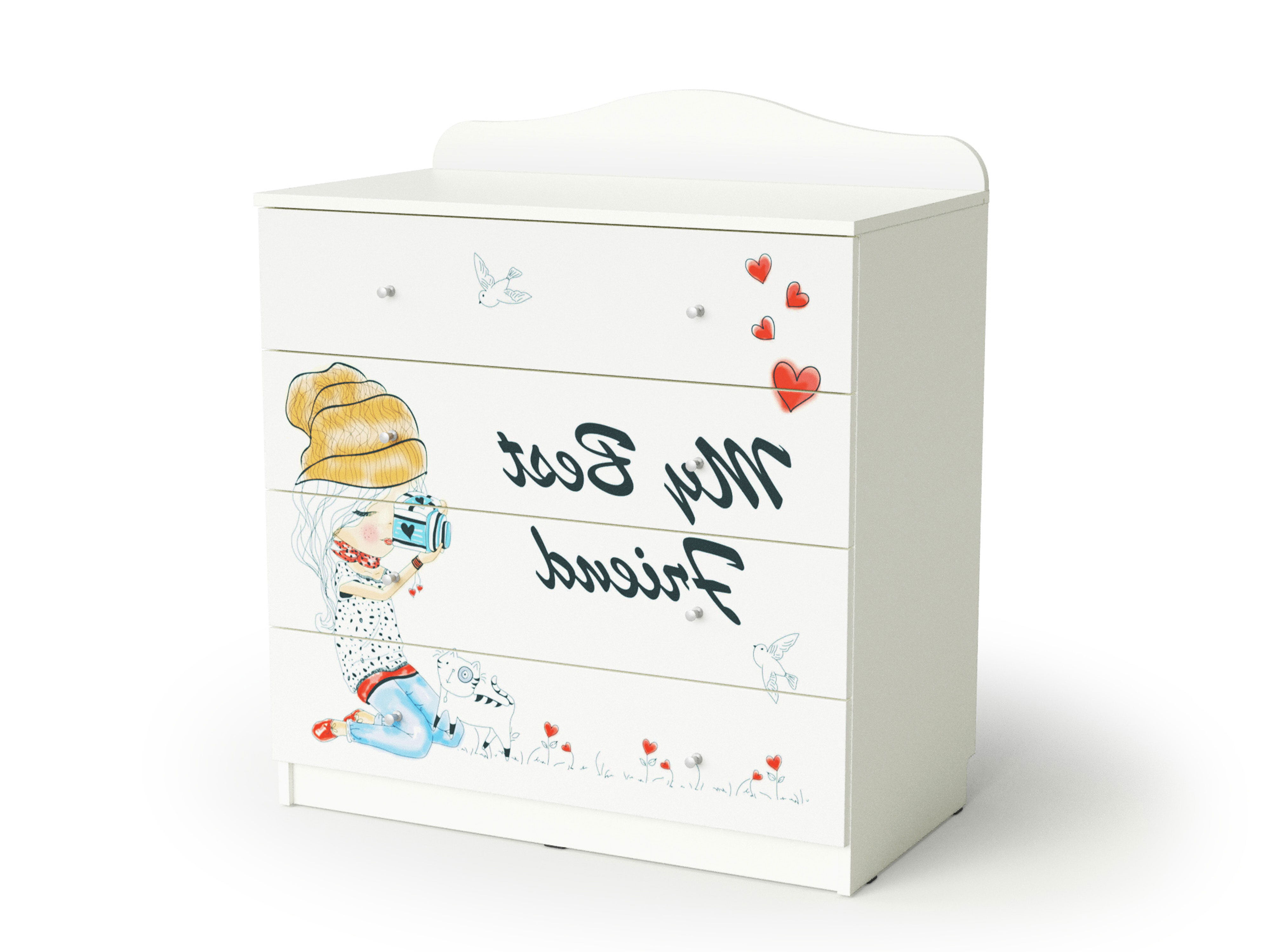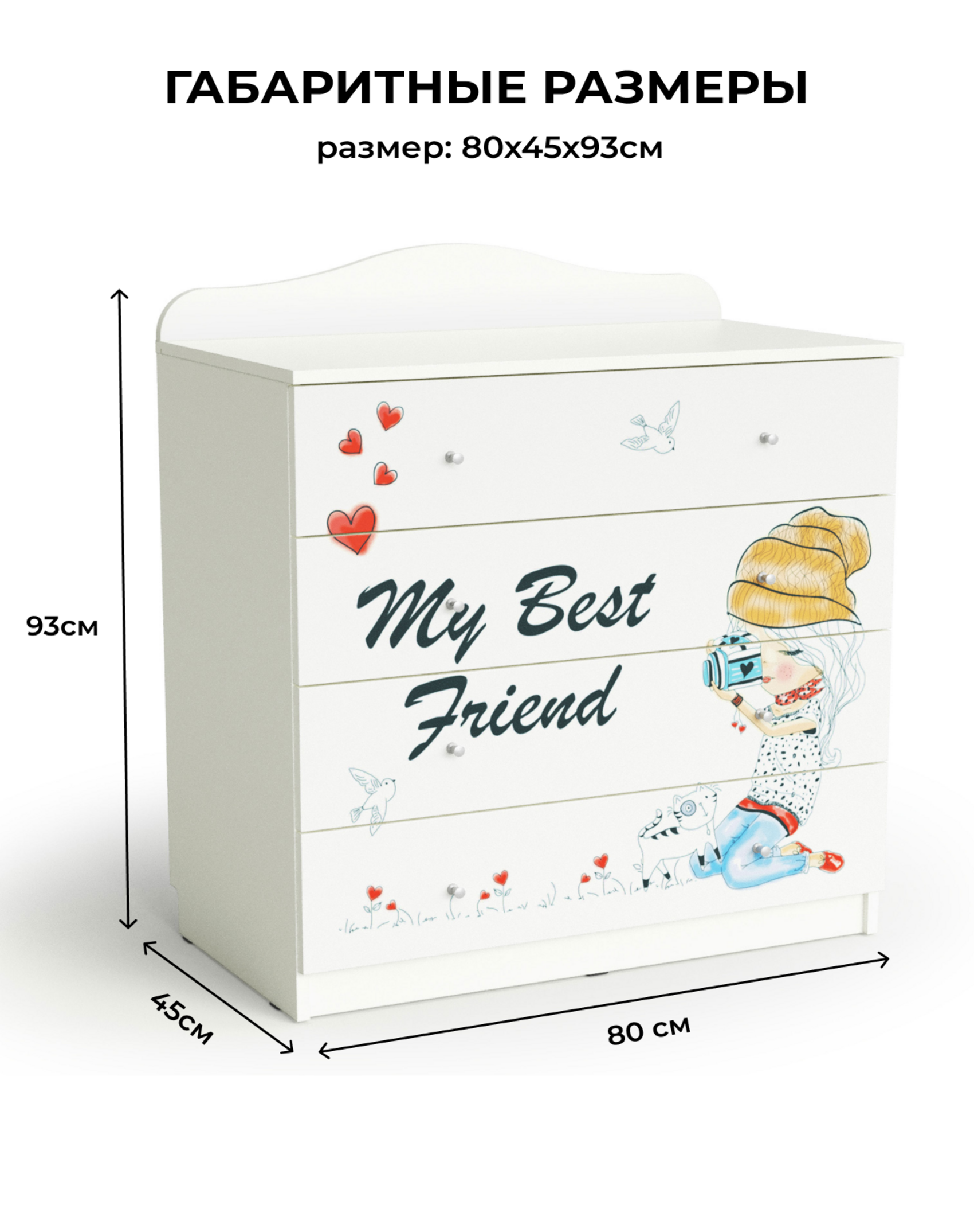 Комод из коллекции мебели для детской комнаты. Производство Россия. Изготовлен из ЛДСП с УФ печатью. Направляющие на выдвижных ящиках шариковые полного выдвижения.