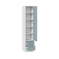 Серо-голубой цвет фасада в сочетании с белой текстурой каркаса добавляет коллекции свежести и вдохновения. Мятный оттенок органично вписывается в различные стилевые направления в дизайне, а белые торцевые ручки завершают единый образ коллекции.