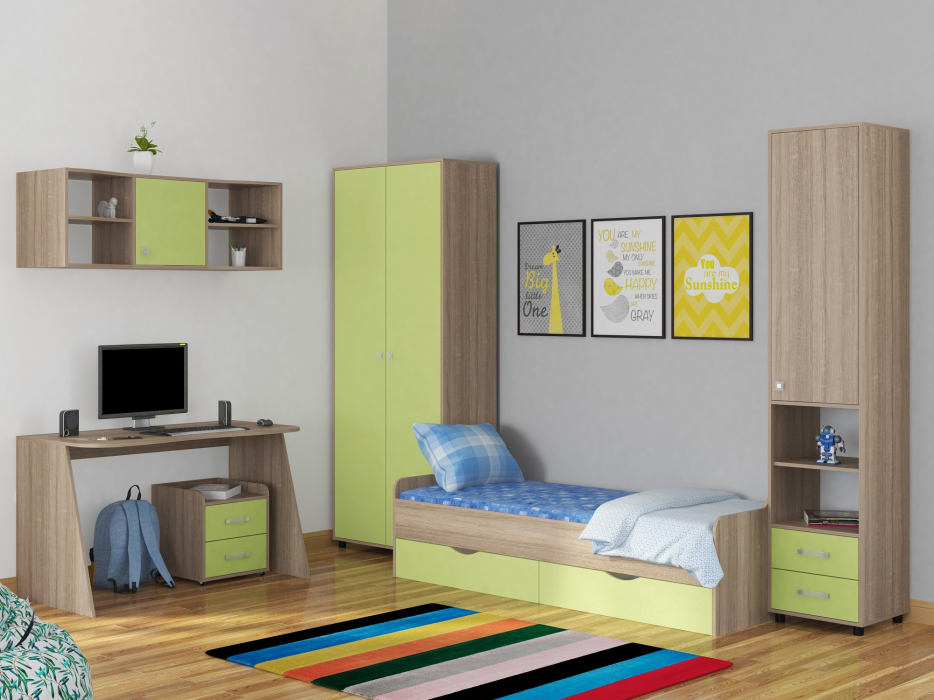 Комплект детской мебели – идеальный вариант для современной жилой комнаты вашего ребенка. Мебель изготавливается из высококачественного ЛДСП с безопасным кромлением всех деталей. Широкий спектр цветовых решений корпусов и фасадов позволит вам встроить нашу мебель в любой интерьер. Состав набора