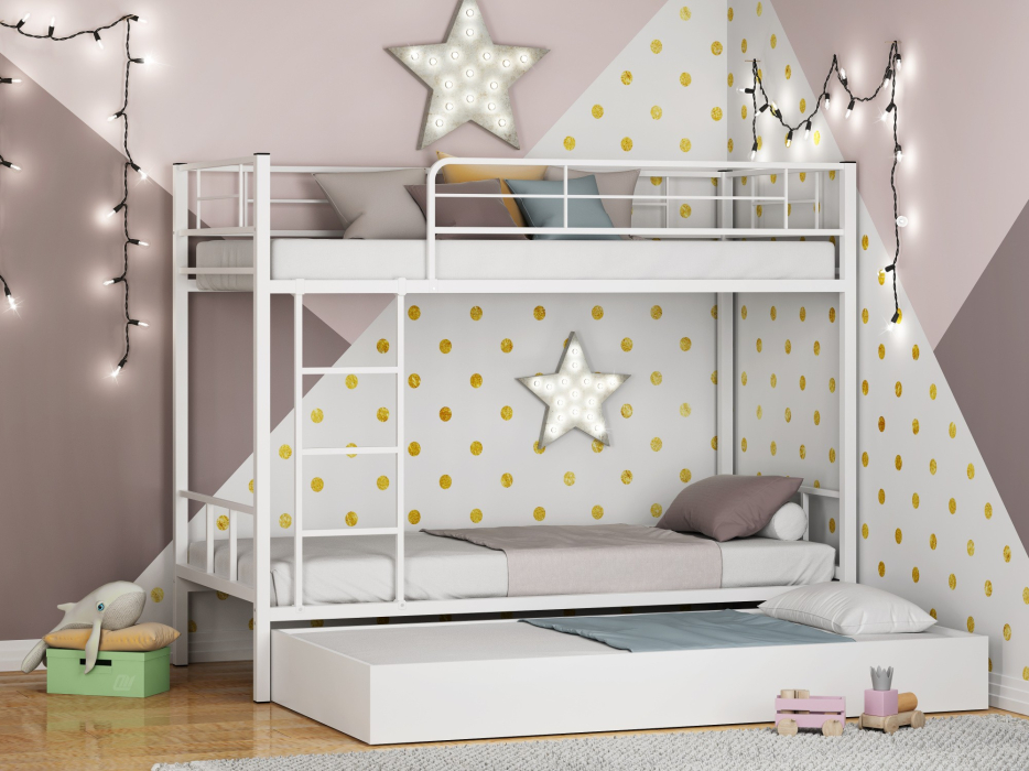 Кровать выполнена из металла с качественным порошковым покрытием. Облегченная конструкция нашей мебели позволяет сделать интерьер менее загруженным, что очень важно при формировании небольших пространств. Кровать выдерживает повышенные нагрузки на спальные места до 180 кг. Простота сборки сделает вашу покупку еще приятнее. Размер нижнего спального места 90*190, верхнего 90*190, выкатного 90*185.