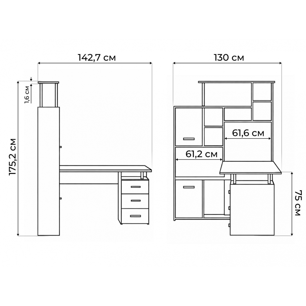 Стол КС-15 венге / дуб молочный левый; ЛДСП. Высота столешницы 75см. Рабочее место - 142х62см. Толщина ЛДСП - 16мм. Имеется 3 выкатных ящика на роликовых направляющих, 4 закрытых дверьми полки. Огромная вместительность для учёбы