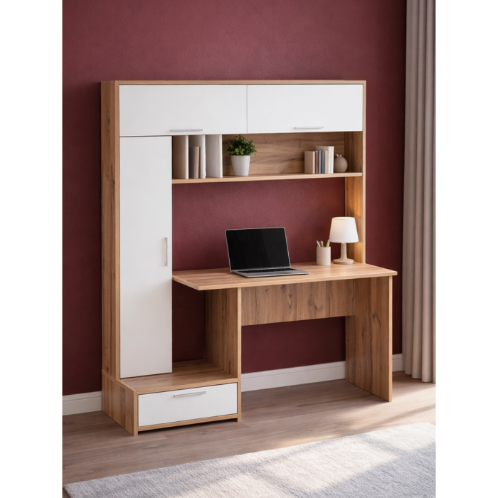 Стол Лайт 03.243 дуб золотой (craft) / белый премиум; ЛДСП. Высота стола без надстройки - 75см. Толщина столешницы - 1,6см. Горизонтальные фасады на газовых амортизаторах. Распашные двери на четырёхшарнирных петлях