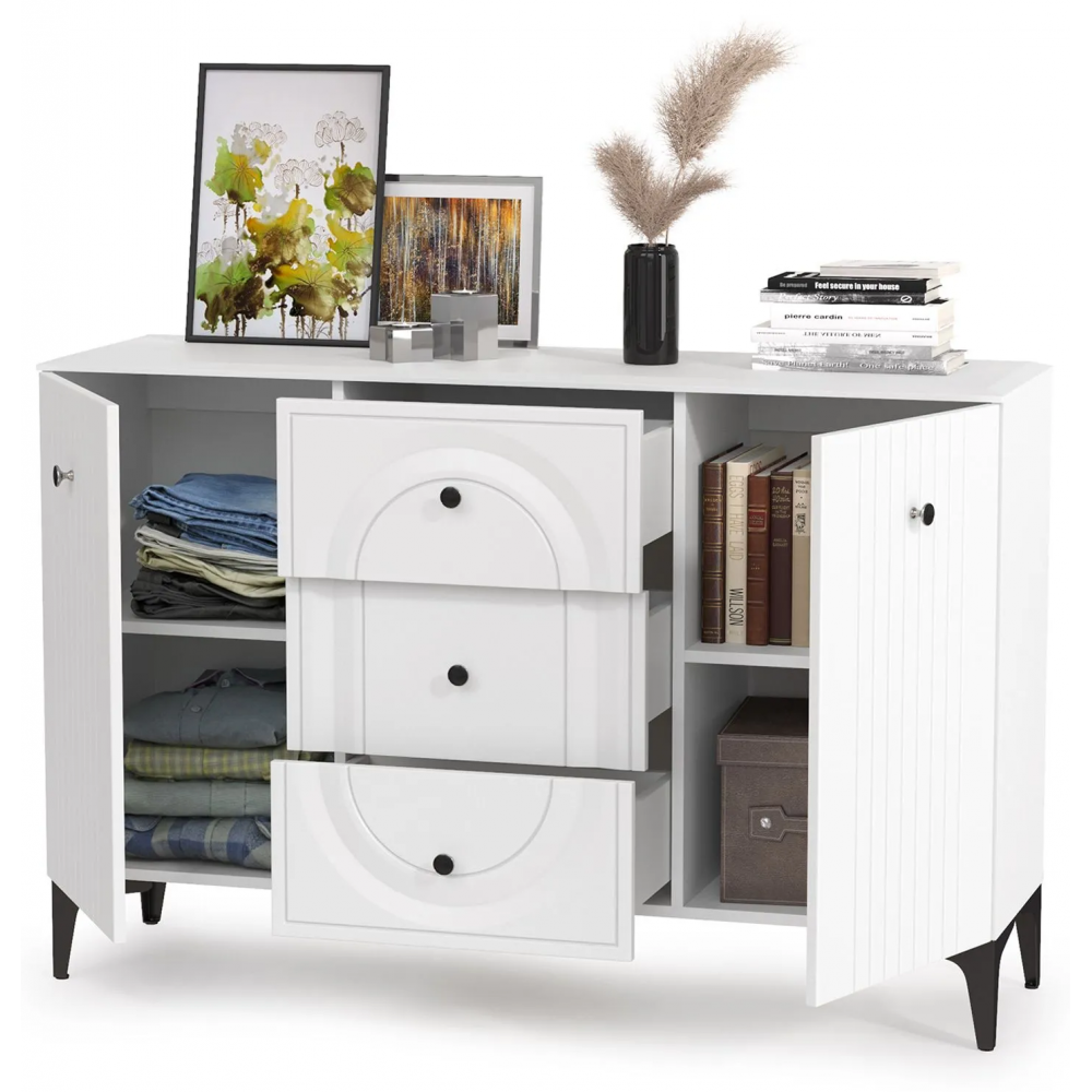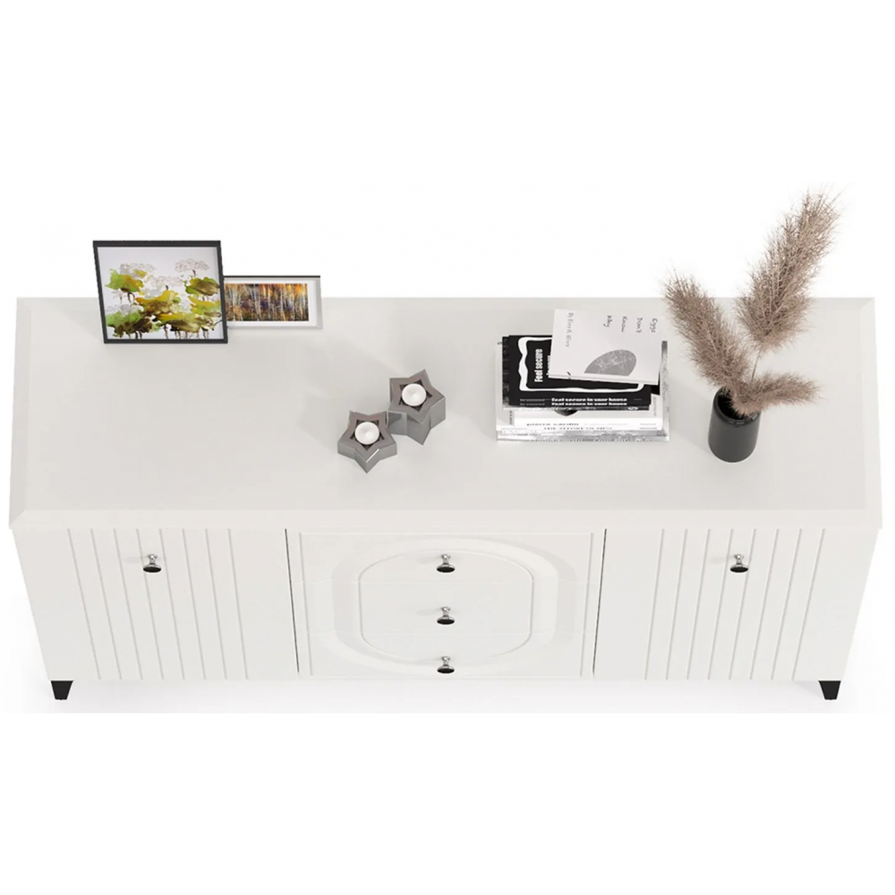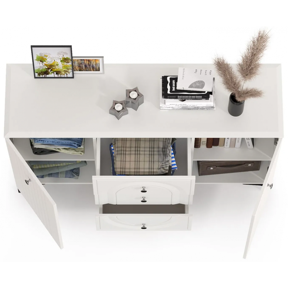 Комод Вестра 13.309 белый pe шагрень / белая шагрень; МДФ, ЛДСП. Комод имеет 3 ящика и 4 полки. Стильные металлические ручки и ножки.