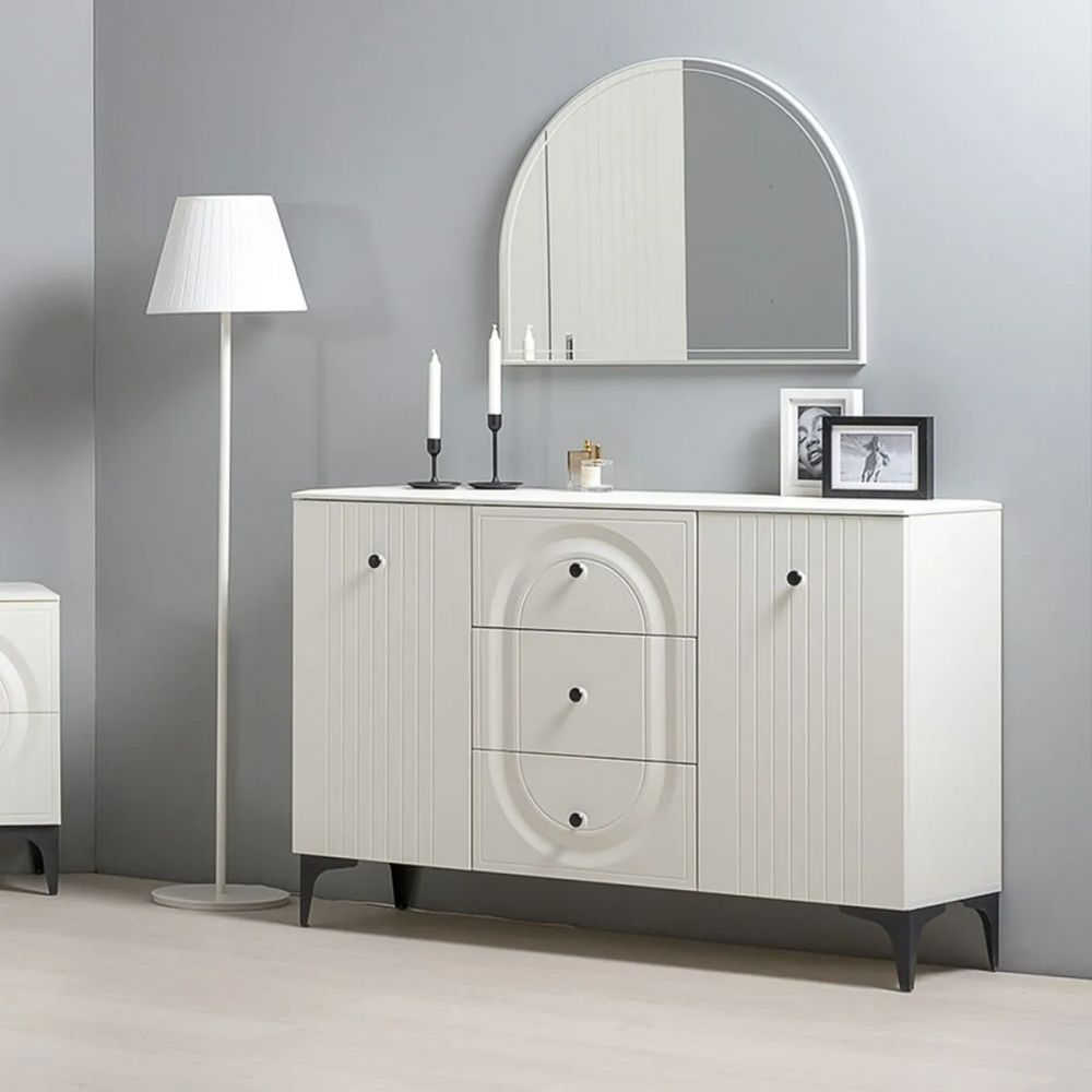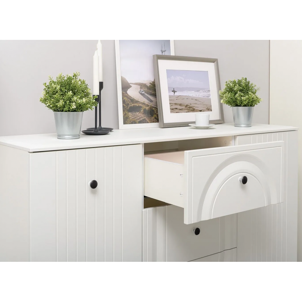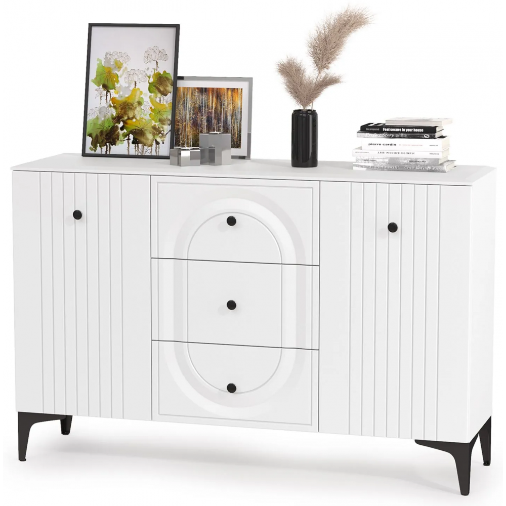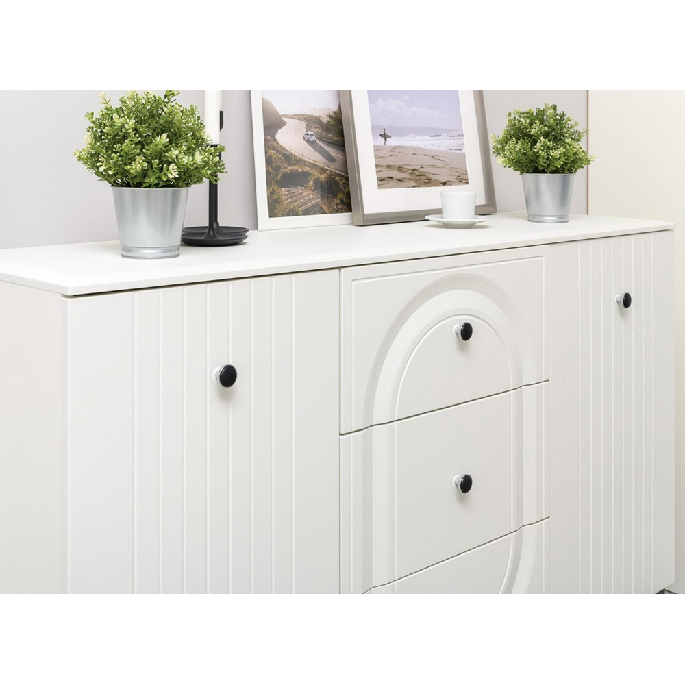 Комод Вестра 13.309 белый pe шагрень / белая шагрень; МДФ, ЛДСП. Комод имеет 3 ящика и 4 полки. Стильные металлические ручки и ножки.