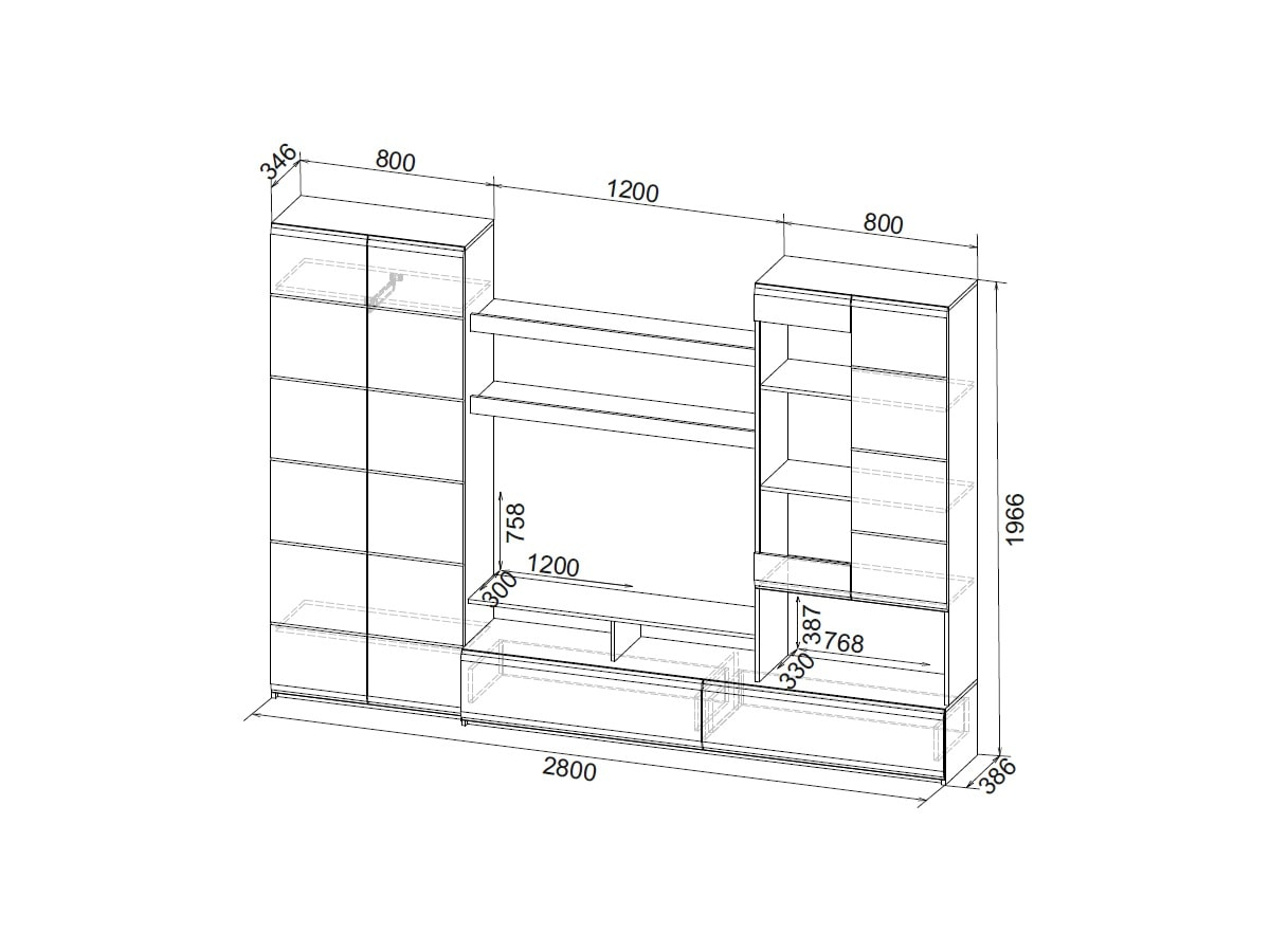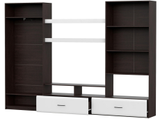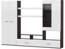 Гостиная Jimenez – это воплощение стиля и функциональности. Сочетание благородного цвета "дуб венге" и белого глянцевого оттенка, а также использование ЛДСП, МДФ и стекла делает ее идеальным выбором для современных интерьеров. В комплекте не большой шкаф, тумба-ТВ, полки и витрина для посуды. В нижней части два ящика. Размеры: ширина 280см, глубина 38,6см, высота 196,6см