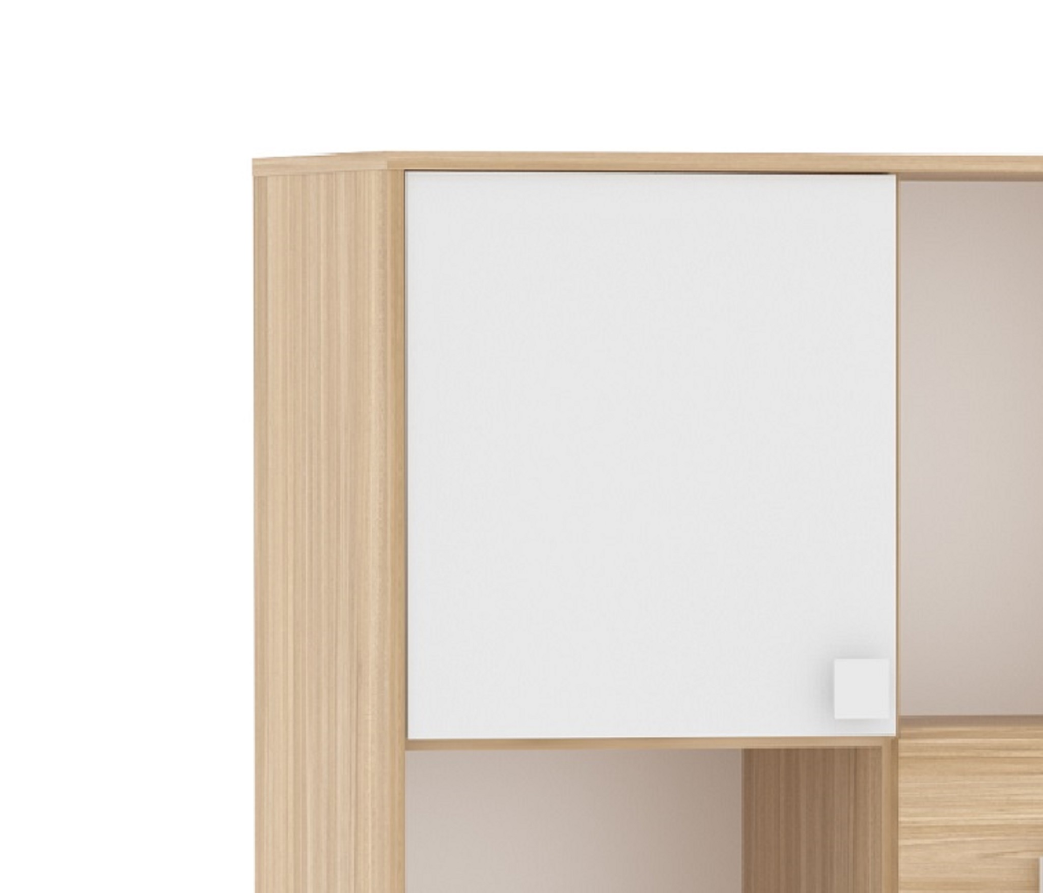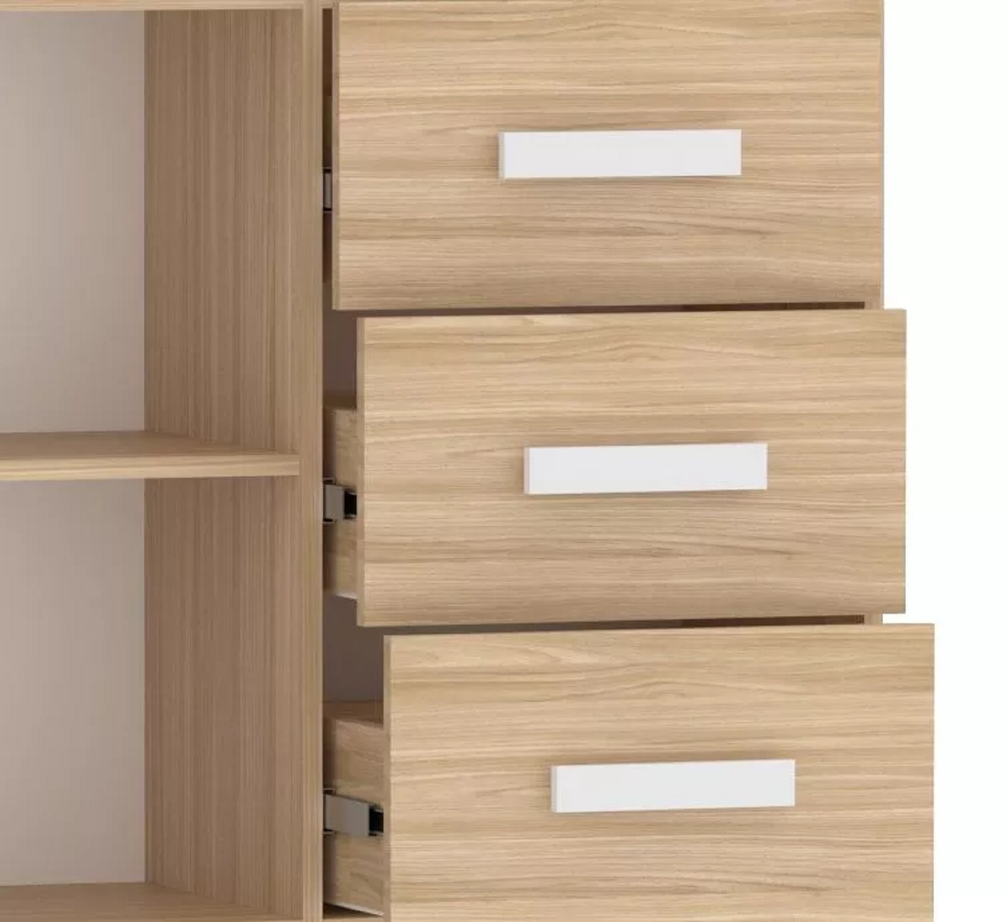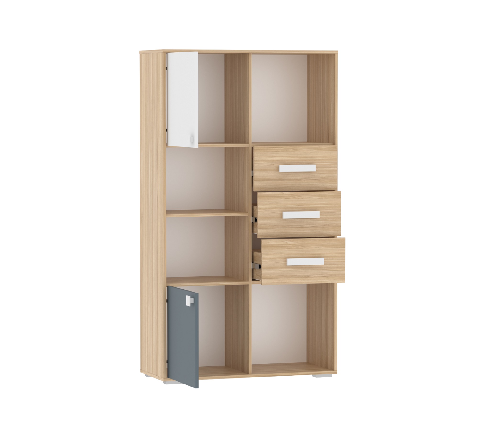 Комбинированный шкаф-стеллаж Элиот НМ 041.73 с открытыми и закрытыми секциями и тремя выдвижными ящиками в середине.