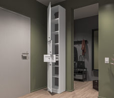 Продуманные детали делают использование стеллажа максимально удобным: шариковые направляющие обеспечивают плавное выдвижение ящика.