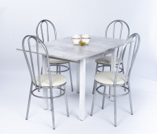 Обеденная группа состоит из стола в сложенном виде 60*80см,в разложенном 80*120 см,выс 75 см.Столешница из ЛДСП.Стол поворотно раскладной.Ножки массив дерева.На ножках подпятники. 4 стула .Диаметр трубы каркаса 20 м