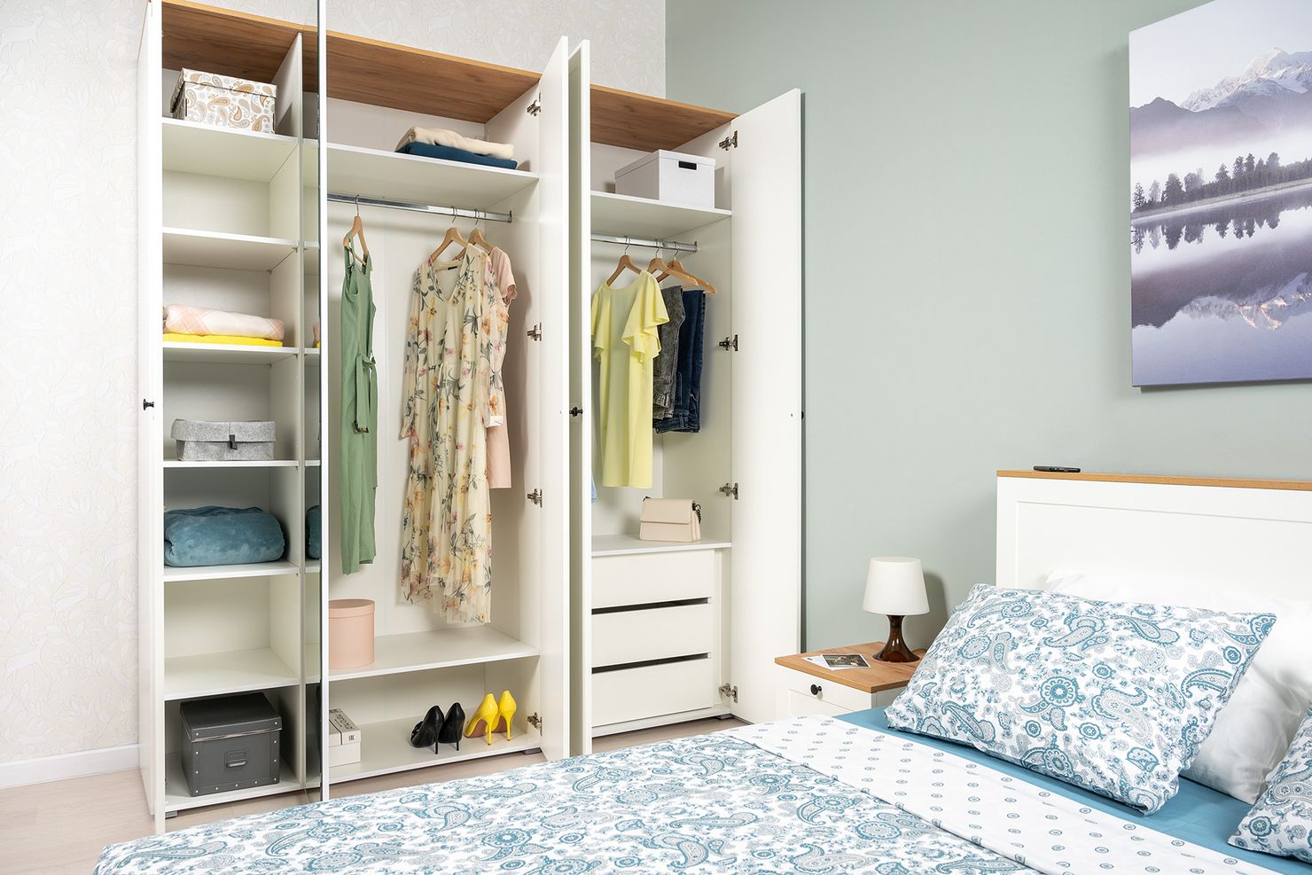 Внутри гардеробная полка, штанга для плечиков и три выдвижных ящика для хранения мелких предметов.