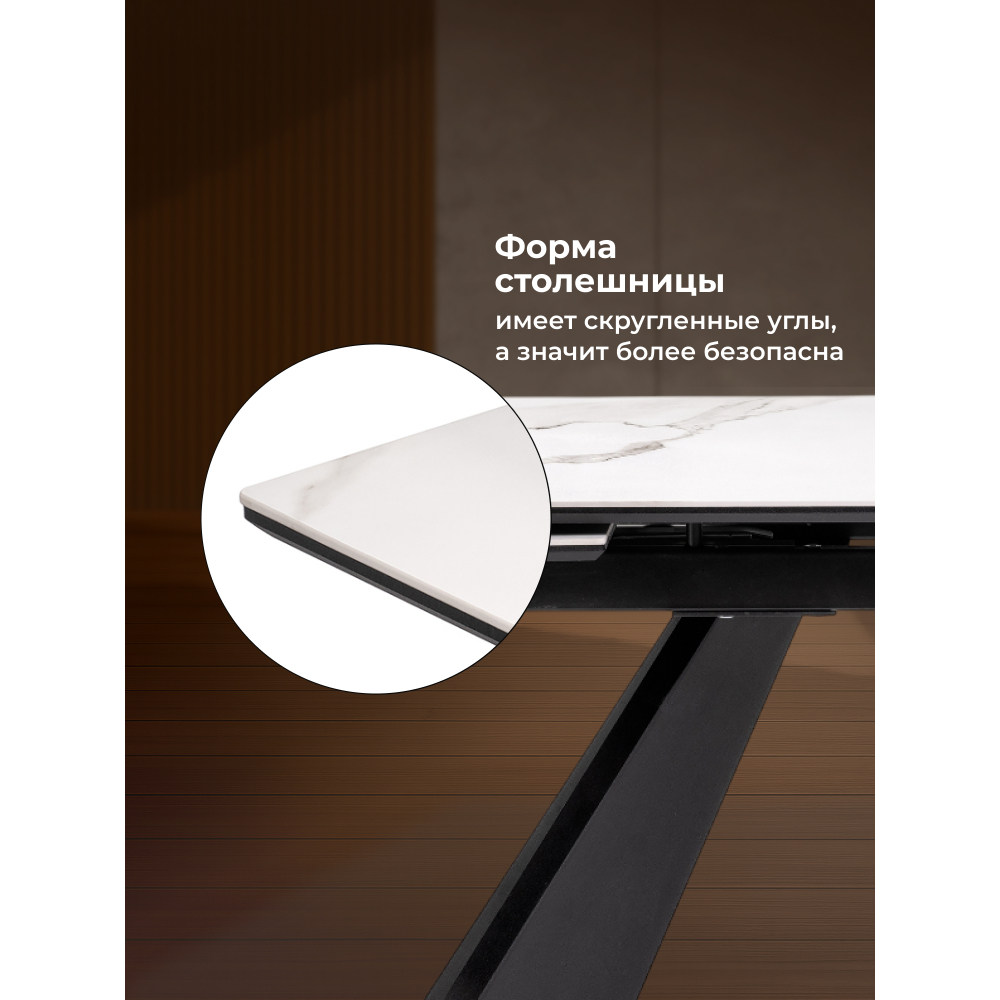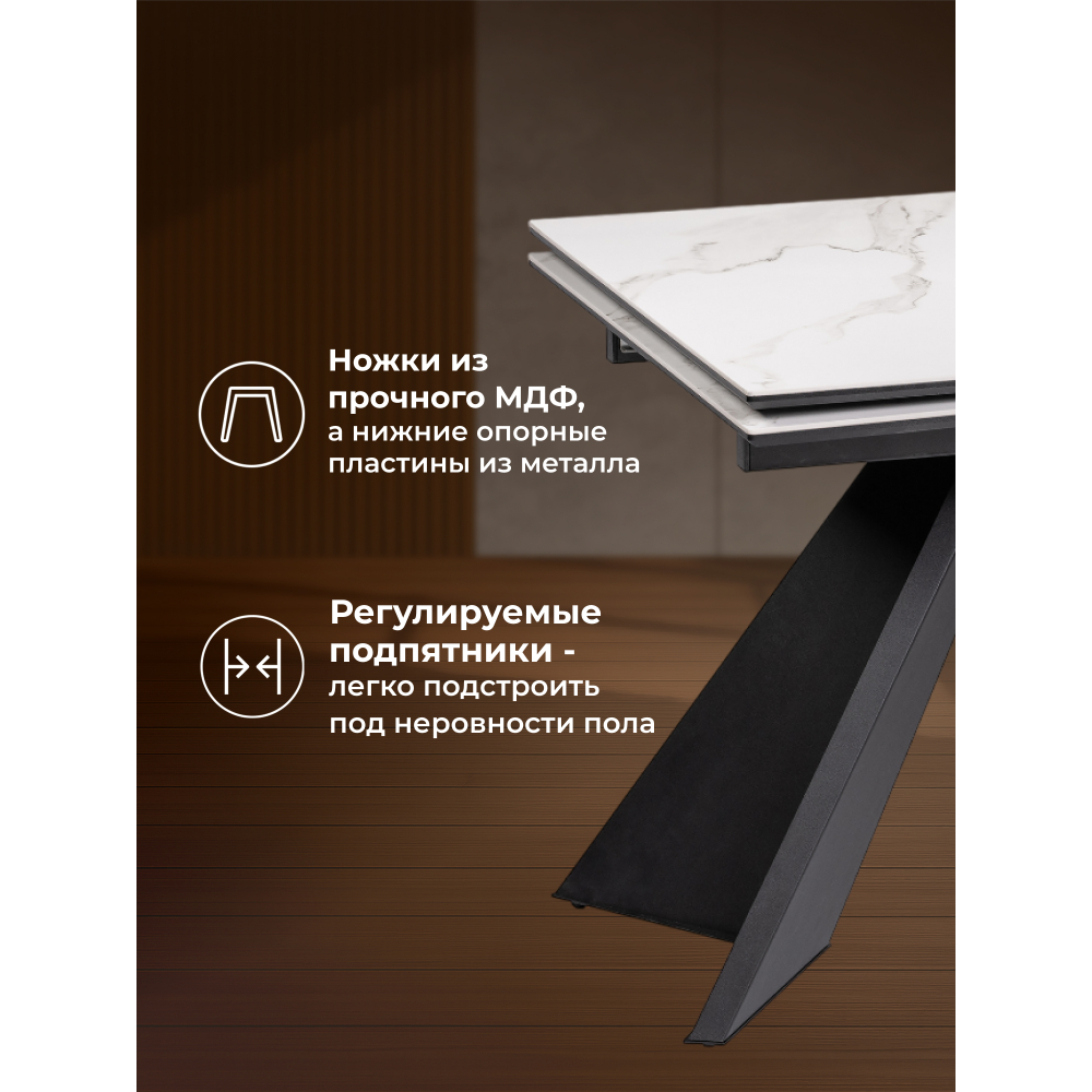 Керамический стол Ливи имеет столешницу, которая состоит из основы из МДФ и покрыта сверху керамическим материалом. Это делает столешницу прочной и долговечной, а также придает ей эффектный внешний вид. Керамическая поверхность также не требует особого ухода, что является еще одним преимуществом.