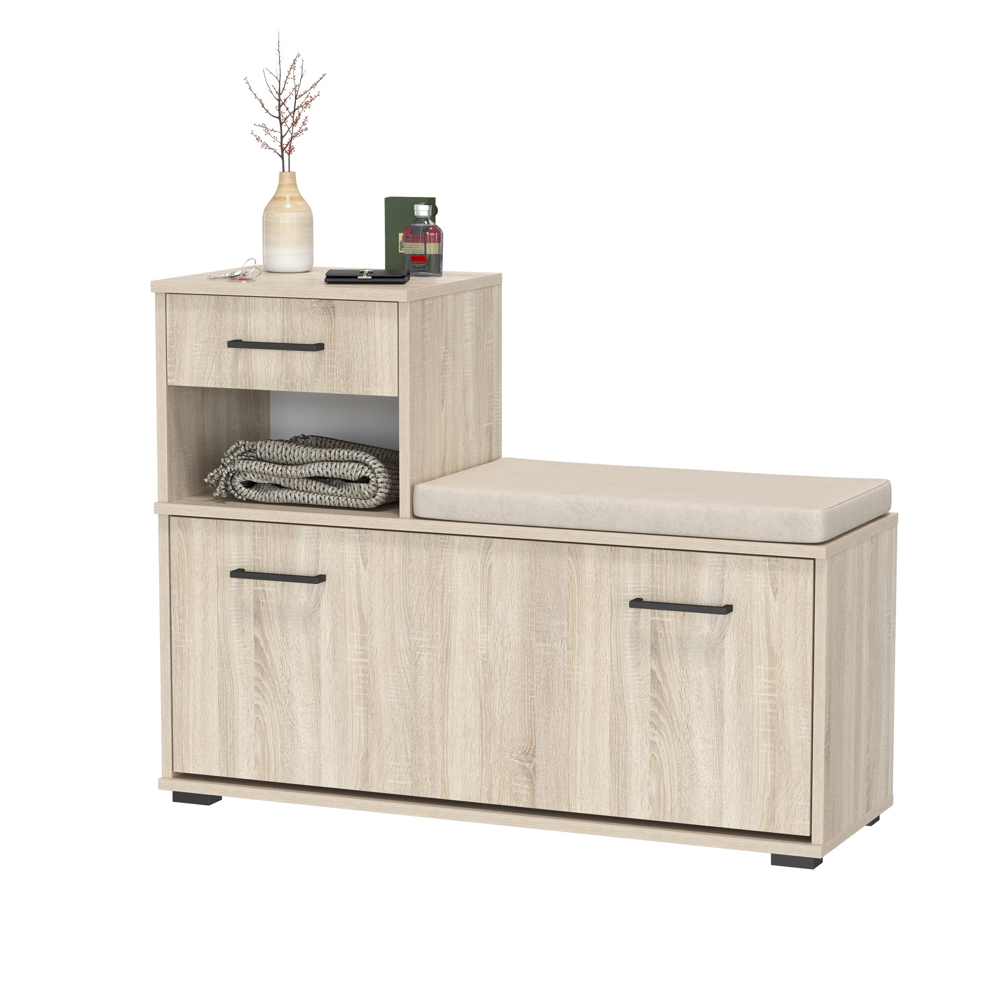 Обувница, за удобной откидной дверкой, разместит до восьми пар сезонной обуви - достаточная вместимость для семьи с детками.