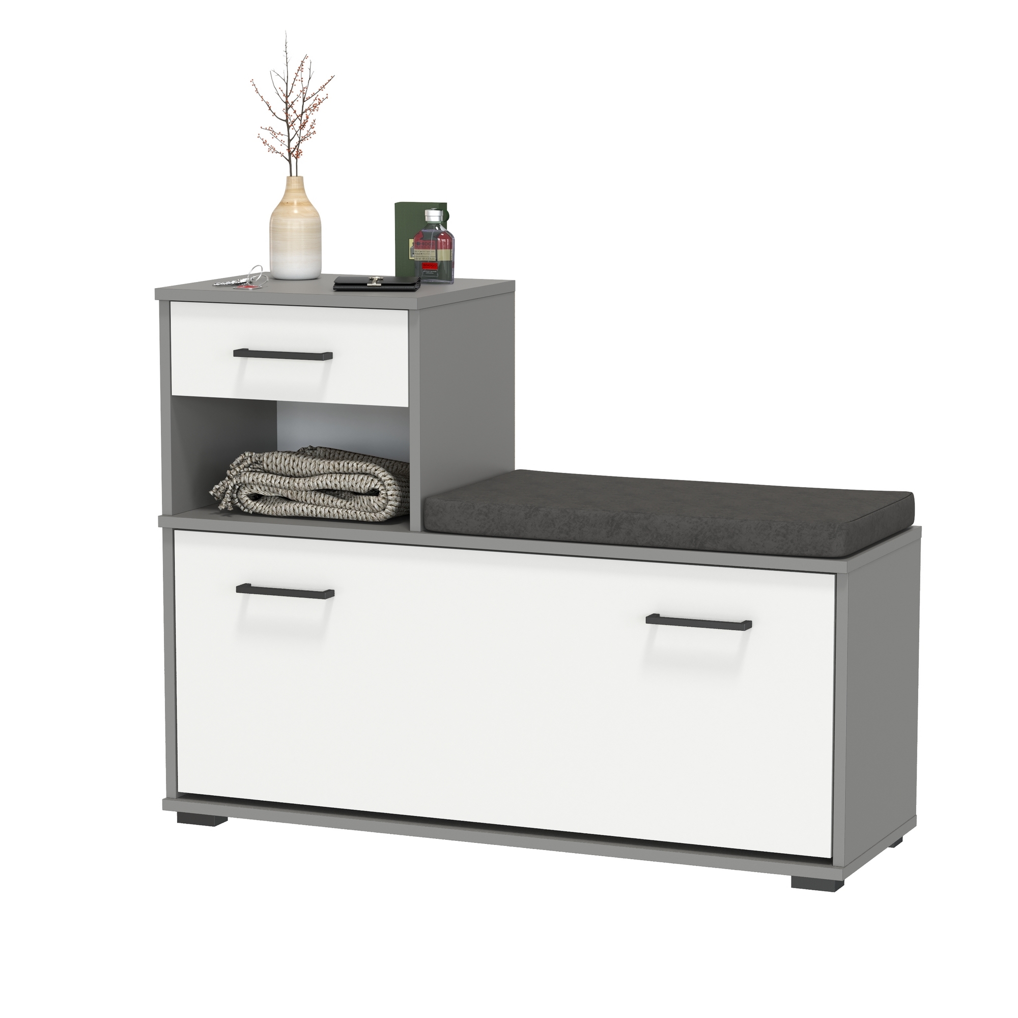 Обувница, за удобной откидной дверкой, разместит до восьми пар сезонной обуви - достаточная вместимость для семьи с детками.