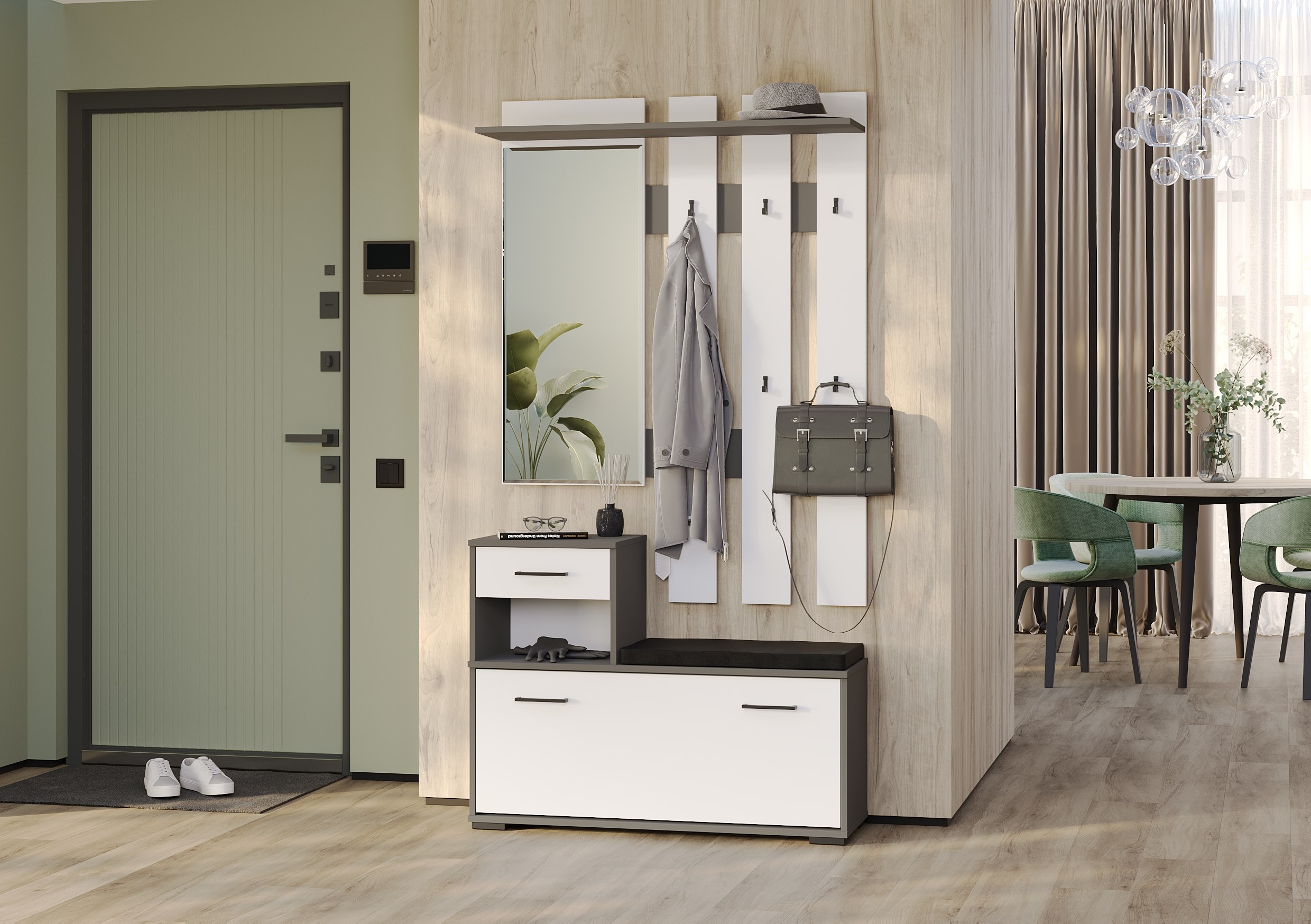 В данной комплектации мебель для прихожих состоит из тумбы под обувь и вешалки с зеркалом. С этим компактным, продуманным и элегантным гарнитуром прихожая будет красивой, опрятной, удобной, стильной, современной и уютной.