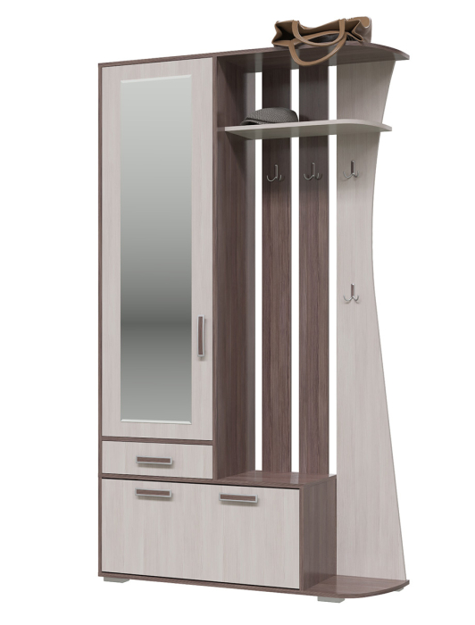 Мокко практично комбинирует классическую открытую вешалку, однодверный шкаф с зеркалом и вместительную обувницу.