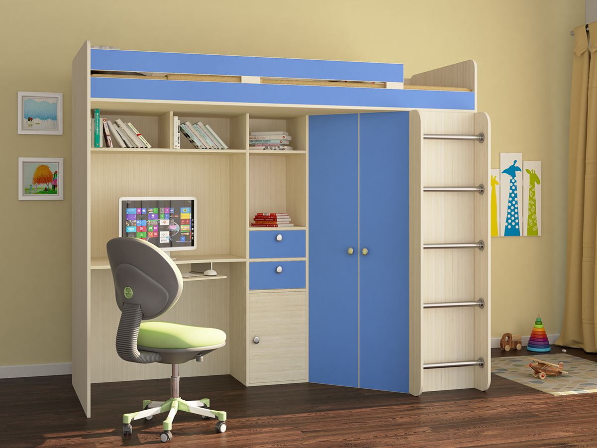 Кровать чердак Астра позволит решить вопрос с обустройством комнаты для ребенка. Под просторным спальным местом, расположенном на самом верху, поместились стол, колонка с удобными ящичками и полноценный шкаф, позволяющий разместить в себе всю одежду ребенка. Доступ к спальному месту осуществляется по надежной металлической лестнице.