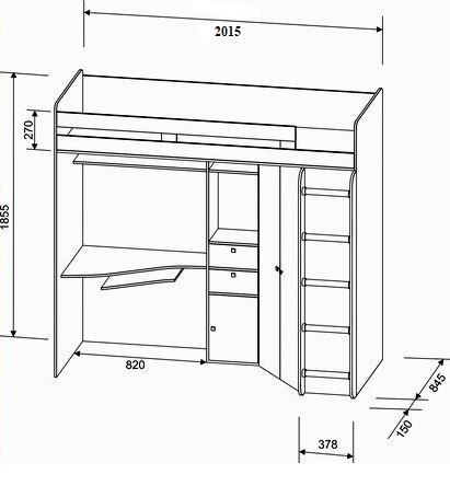 Кровать чердак Астра позволит решить вопрос с обустройством комнаты для ребенка. Под просторным спальным местом, расположенном на самом верху, поместились стол, колонка с удобными ящичками и полноценный шкаф, позволяющий разместить в себе всю одежду ребенка. Доступ к спальному месту осуществляется по надежной металлической лестнице.
