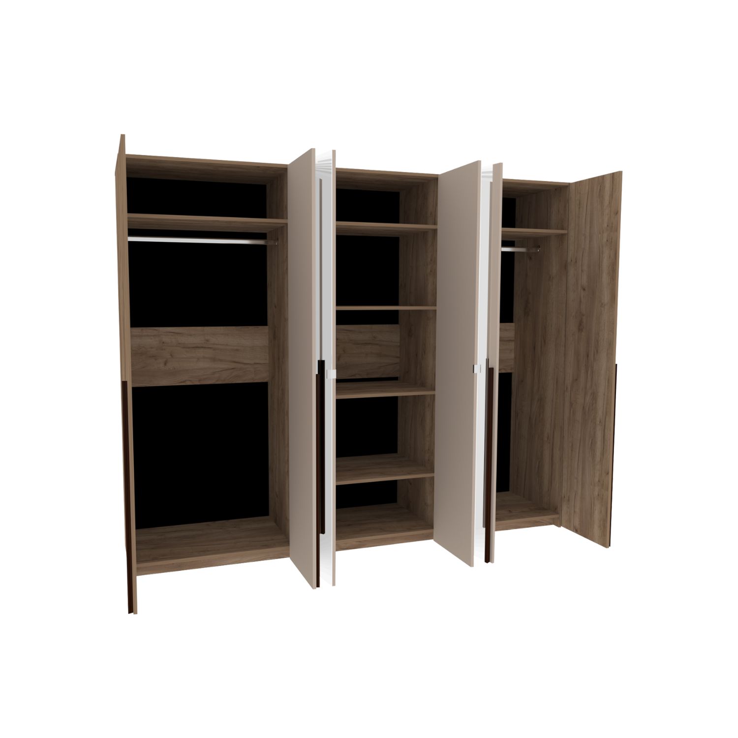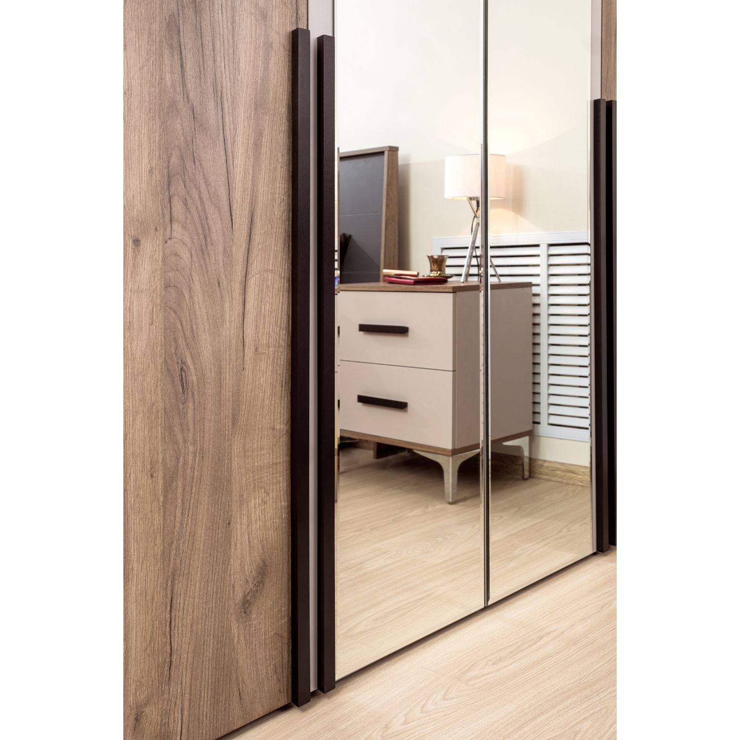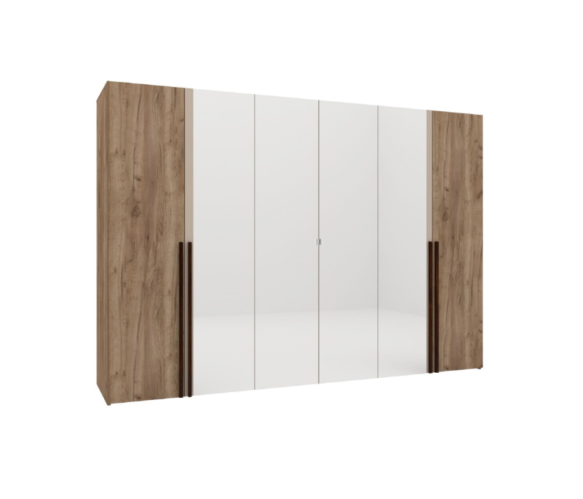 Широкий шкаф для спальни с шестью дверями из коллекции мебели Кара отличается многофункциональным наполнением для удобного размещения одежды. Огранённые фацетом зеркала на фасадах шкафа в полный рост выглядят аккуратно, создавая красивые блики.