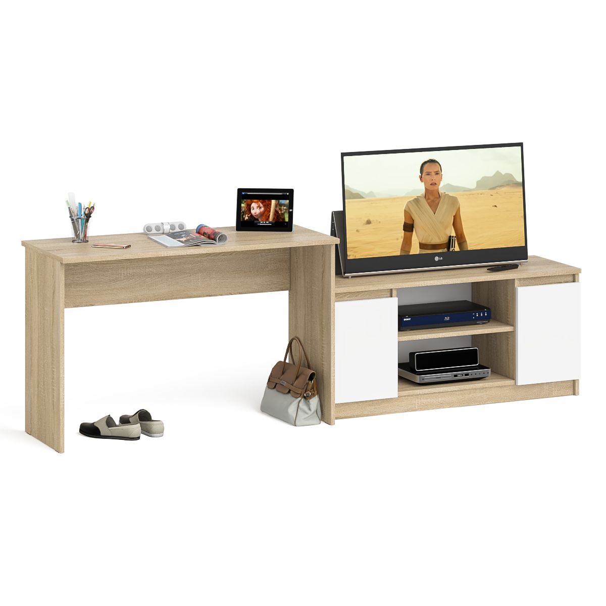 Комплектация включает стол письменный Мори МСП1200.1 и тумбу ТВ Мори МТВ1200.1. Продуманная конструкция позволяет убрать лишние предметы, тем самым сохраняя единый стиль оформления помещения. Отсутствие ручек главное преимущество данной модели. Роль ручек выполняют сами фасады. Стол письменный Мори МСП1200.1 - простой аккуратный стол без тумб и ящиков - минималистичный дизайн и доступная цена. Столещница размером 120х50 см. вместит все необходимые принадлежности для работы. По бокам располагаются две опоры из ЛДСП выполняющие роль ножек. С задней стороны стола имеется царга - верхняя соединительная планка между ножками. Тумба ТВ Мори МТВ1200.1 состоит из открытой ниши по центру и двумя закрытыми распашными дверками по краям. Все ниши имеет полочку по середине. На тумбе достаточно места для размещения телевизора дигональю 47 дюймов. Можно использовать как ТВ тумбу, так и обычную для хранения и размещения Ваших вещей.
