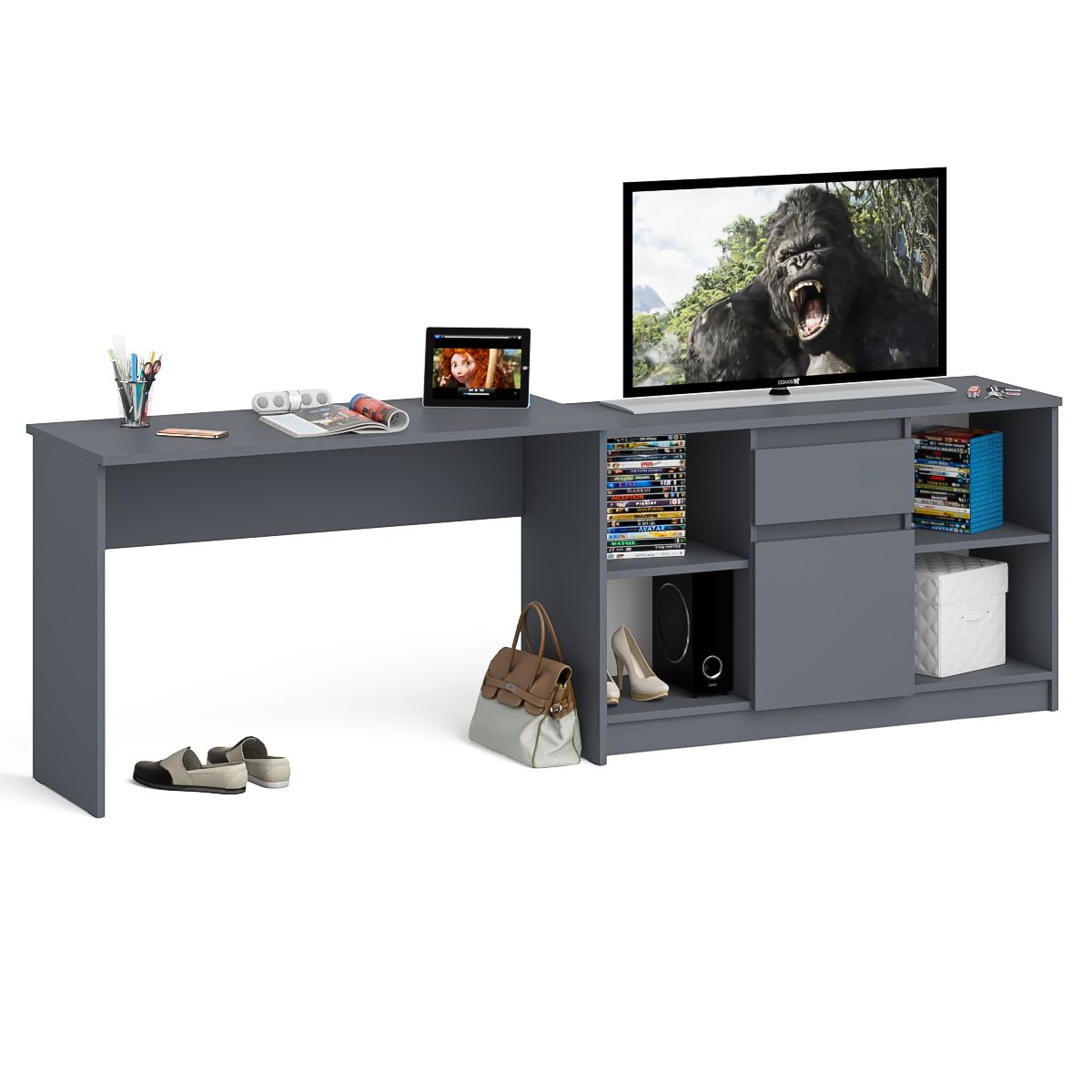 Комплектация включает стол письменный Мори МСП1200.1 и тумбу ТВ Мори МТВ1204.1. Продуманная конструкция позволяет убрать лишние предметы, тем самым сохраняя единый стиль оформления помещения. Отсутствие ручек главное преимущество данной модели. Роль ручек выполняют сами фасады. Стол письменный Мори МСП1200.1 - простой аккуратный стол без тумб и ящиков - минималистичный дизайн и доступная цена. Столещница размером 120х50 см. вместит все необходимые принадлежности для работы. По бокам располагаются две опоры из ЛДСП выполняющие роль ножек. С задней стороны стола имеется царга - верхняя соединительная планка между ножками. Тумба ТВ Мори МТВ1204.1 состоит из двух открытых ниш по бокам и ящика и закрытой нишей по центру. Все ниши имеет полочку по середине. На тумбе достаточно места для размещения телевизора дигональю 47 дюймов. Можно использовать как ТВ тумбу, так и обычную для хранения и размещения Ваших вещей.