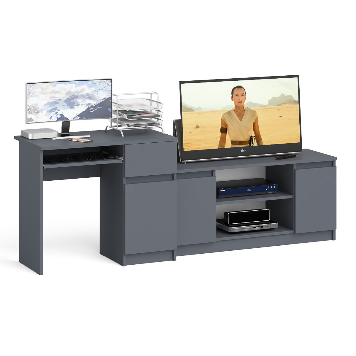 Комплектация включает стол компьютерный Мори МС-1 правый и тумбу ТВ Мори МТВ1200.1. Продуманная конструкция позволяет убрать лишние предметы, тем самым сохраняя единый стиль оформления помещения. Отсутствие ручек главное преимущество данной модели. Роль ручек выполняют сами фасады. Аккуратный стол Мори МС-1 правый компьютерный с тумбой и выдвижной панелью для клавиатуры. Тумба имеет нишу с полочкой за распашной дверкой и выдвижной ящик на роликовых направляющих. Стол компьютерный Мори МС-1 правый не имеет универсальной сборки - выдвижной ящик расположен справа. Тумба ТВ Мори МТВ1200.1 состоит из открытой ниши по центру и двумя закрытыми распашными дверками по краям. Все ниши имеет полочку по середине. На тумбе достаточно места для размещения телевизора дигональю 47 дюймов. Можно использовать как ТВ тумбу, так и обычную для хранения и размещения Ваших вещей.