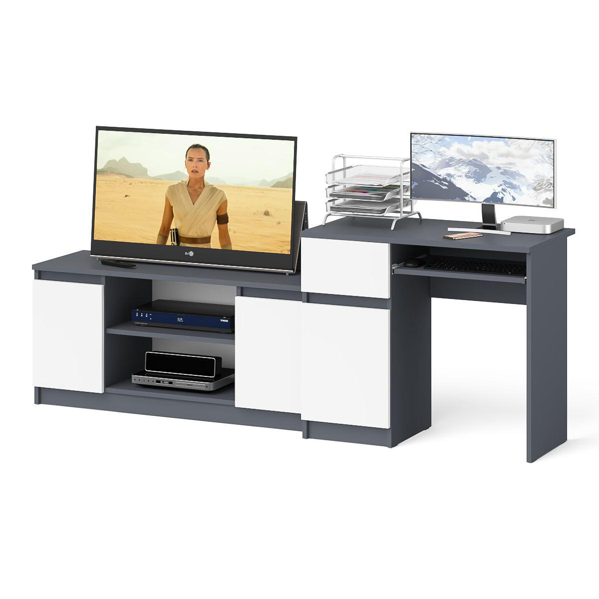 Комплектация включает стол компьютерный Мори МС-1 левый и тумбу ТВ Мори МТВ1200.1. Продуманная конструкция позволяет убрать лишние предметы, тем самым сохраняя единый стиль оформления помещения. Отсутствие ручек главное преимущество данной модели. Роль ручек выполняют сами фасады. Небольшой стол компьютерный Мори МС-1 левый с тумбой и выдвижной панелью для клавиатуры. Тумба имеет нишу с полочкой за распашной дверкой и выдвижной ящик на роликовых направляющих. Стол компьютерный Мори МС-1 левый не имеет универсальной сборки - выдвижной ящик расположен слева. Тумба ТВ Мори МТВ1200.1 состоит из открытой ниши по центру и двумя закрытыми распашными дверками по краям. Все ниши имеет полочку по середине. На тумбе достаточно места для размещения телевизора дигональю 47 дюймов. Можно использовать как ТВ тумбу, так и обычную для хранения и размещения Ваших вещей.