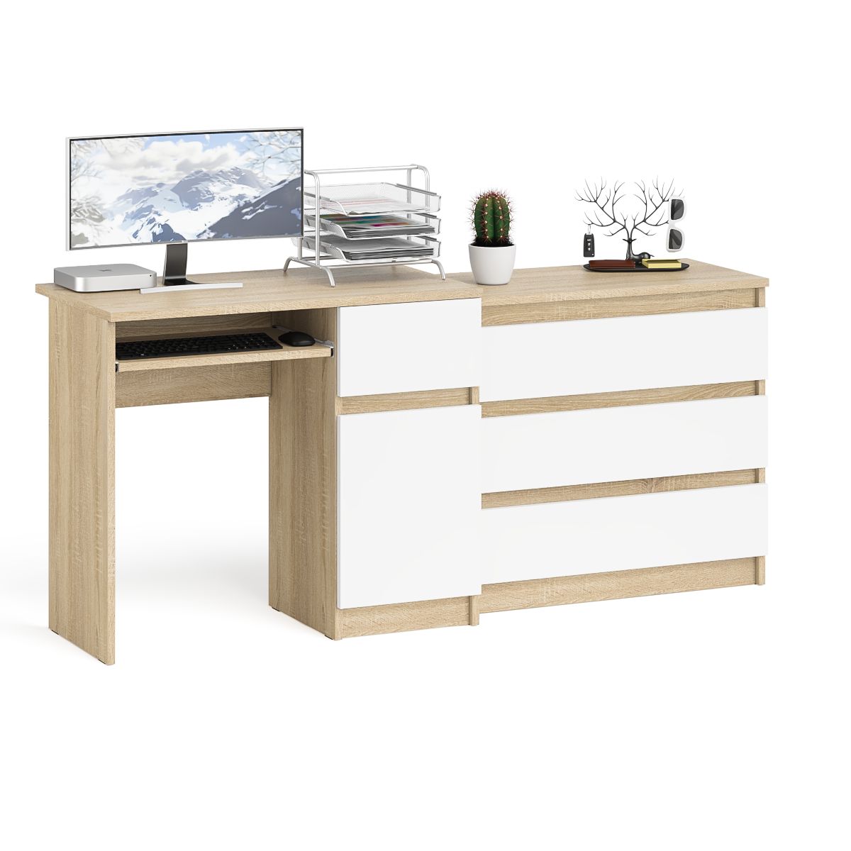 Комплектация включает стол компьютерный Мори МС-1 правый и комод Мори МК800.1. Продуманная конструкция позволяет убрать лишние предметы, тем самым сохраняя единый стиль оформления помещения. Отсутствие ручек главное преимущество данной модели. Роль ручек выполняют сами фасады. Аккуратный стол Мори МС-1 правый компьютерный с тумбой и выдвижной панелью для клавиатуры. Тумба имеет нишу с полочкой за распашной дверкой и выдвижной ящик на роликовых направляющих. Стол компьютерный Мори МС-1 правый не имеет универсальной сборки - выдвижной ящик расположен справа. Классический комод Мори МК800.1 с тремя выдвижными ящиками на роликовых направляющих.