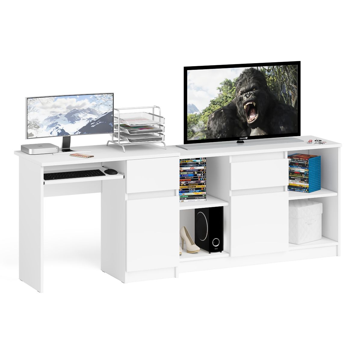 Комплектация включает стол компьютерный Мори МС-1 правый и тумбу ТВ Мори МТВ1204.1. Продуманная конструкция позволяет убрать лишние предметы, тем самым сохраняя единый стиль оформления помещения. Отсутствие ручек главное преимущество данной модели. Роль ручек выполняют сами фасады. Аккуратный стол Мори МС-1 правый компьютерный с тумбой и выдвижной панелью для клавиатуры. Тумба имеет нишу с полочкой за распашной дверкой и выдвижной ящик на роликовых направляющих. Стол компьютерный Мори МС-1 правый не имеет универсальной сборки - выдвижной ящик расположен справа. Тумба ТВ Мори МТВ1204.1 состоит из двух открытых ниш по бокам и ящика и закрытой нишей по центру. Все ниши имеет полочку по середине. На тумбе достаточно места для размещения телевизора дигональю 47 дюймов. Можно использовать как ТВ тумбу, так и обычную для хранения и размещения Ваших вещей.