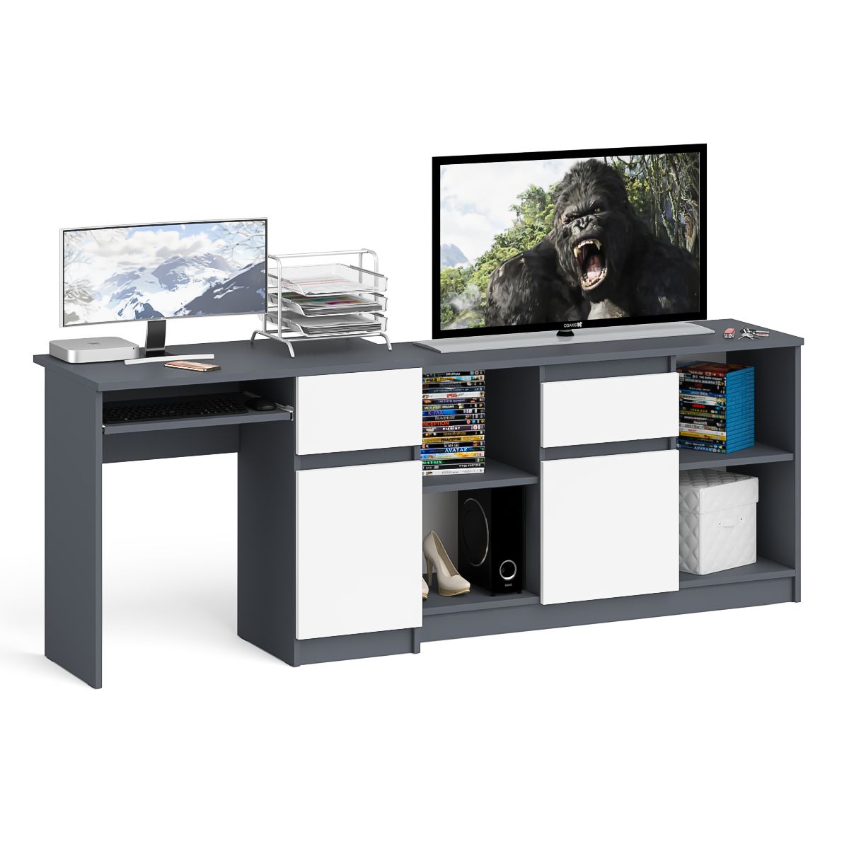 Комплектация включает стол компьютерный Мори МС-1 правый и тумбу ТВ Мори МТВ1204.1. Продуманная конструкция позволяет убрать лишние предметы, тем самым сохраняя единый стиль оформления помещения. Отсутствие ручек главное преимущество данной модели. Роль ручек выполняют сами фасады. Аккуратный стол Мори МС-1 правый компьютерный с тумбой и выдвижной панелью для клавиатуры. Тумба имеет нишу с полочкой за распашной дверкой и выдвижной ящик на роликовых направляющих. Стол компьютерный Мори МС-1 правый не имеет универсальной сборки - выдвижной ящик расположен справа. Тумба ТВ Мори МТВ1204.1 состоит из двух открытых ниш по бокам и ящика и закрытой нишей по центру. Все ниши имеет полочку по середине. На тумбе достаточно места для размещения телевизора дигональю 47 дюймов. Можно использовать как ТВ тумбу, так и обычную для хранения и размещения Ваших вещей.