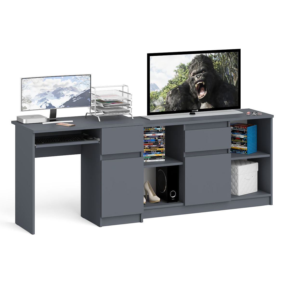 Комплектация включает стол компьютерный Мори МС-1 правый и тумбу ТВ Мори МТВ1204.1. Продуманная конструкция позволяет убрать лишние предметы, тем самым сохраняя единый стиль оформления помещения. Отсутствие ручек главное преимущество данной модели. Роль ручек выполняют сами фасады. Аккуратный стол Мори МС-1 правый компьютерный с тумбой и выдвижной панелью для клавиатуры. Тумба имеет нишу с полочкой за распашной дверкой и выдвижной ящик на роликовых направляющих. Стол компьютерный Мори МС-1 правый не имеет универсальной сборки - выдвижной ящик расположен справа. Тумба ТВ Мори МТВ1204.1 состоит из двух открытых ниш по бокам и ящика и закрытой нишей по центру. Все ниши имеет полочку по середине. На тумбе достаточно места для размещения телевизора дигональю 47 дюймов. Можно использовать как ТВ тумбу, так и обычную для хранения и размещения Ваших вещей.