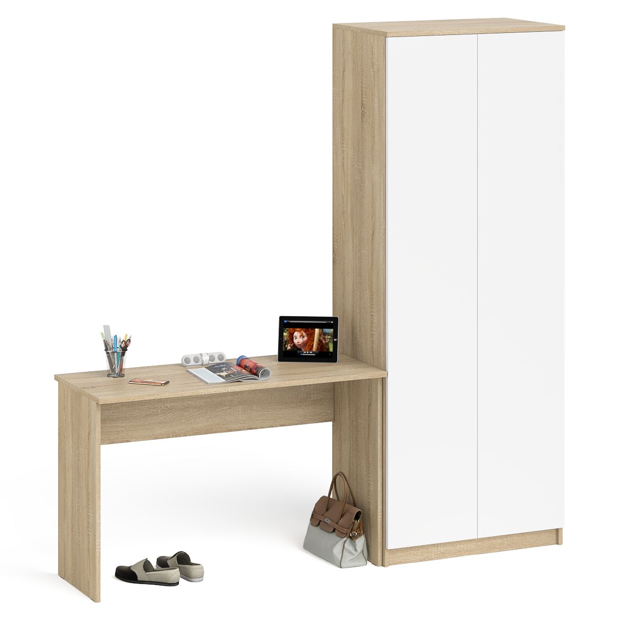 Комплектация включает стол письменный Мори МСП1200.1 и шкаф двухдверный Мори МШ800.1. Продуманная конструкция позволяет убрать лишние предметы, тем самым сохраняя единый стиль оформления помещения. Роль ручек выполняют сами фасады. Стол письменный Мори МСП1200.1 - простой аккуратный стол без тумб и ящиков - минималистичный дизайн и доступная цена. Столещница размером 120х50 см. вместит все необходимые принадлежности для работы. По бокам располагаются две опоры из ЛДСП выполняющие роль ножек. С задней стороны стола имеется царга - верхняя соединительная планка между ножками. Шкаф Мори МШ800.1 оборудован двумя распашными дверями. За дверями расположены горизонтальная штанга (762 мм.) для одежды на плечиках, антресольная полка для головных уборов и нижняя ниша.