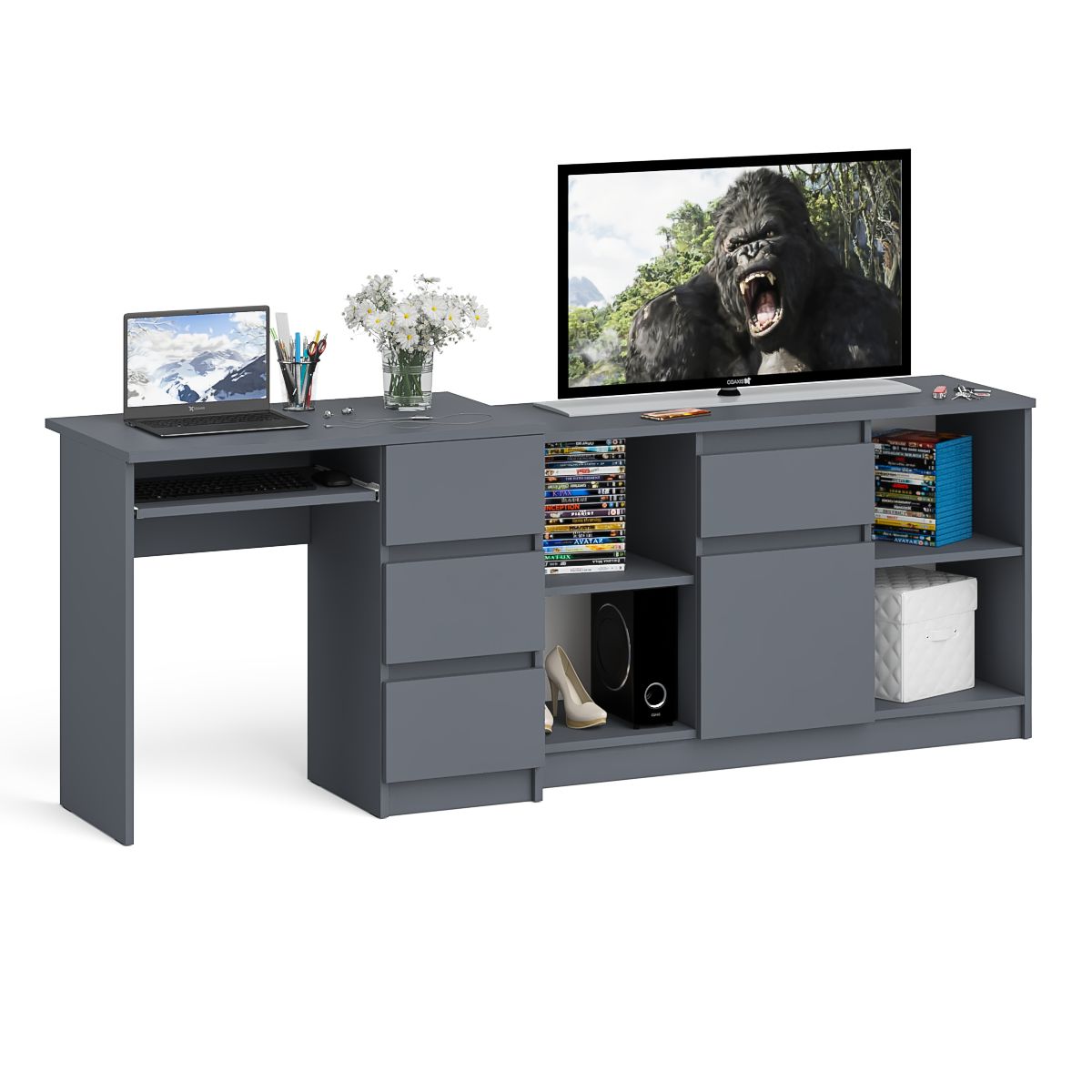 Комплектация включает стол компьютерный Мори МС-6 правый и тумбу ТВ Мори МТВ1204.1. Продуманная конструкция позволяет убрать лишние предметы, тем самым сохраняя единый стиль оформления помещения. Роль ручек выполняют сами фасады. Аккуратный стол Мори МС-6 компьютерный правый с тумбой и выдвижной панелью для клавиатуры. Тумба имеет три выдвижных ящика на роликовых направляющих. Стол компьютерный три ящика Мори МС-6 правый не имеет универсальной сборки - выдвижной ящик расположен слева. Тумба ТВ Мори МТВ1204.1 состоит из двух открытых ниш по бокам и ящика и закрытой нишей по центру. Все ниши имеет полочку по середине. На тумбе достаточно места для размещения телевизора дигональю 47 дюймов. Можно использовать как ТВ тумбу, так и обычную для хранения и размещения Ваших вещей.