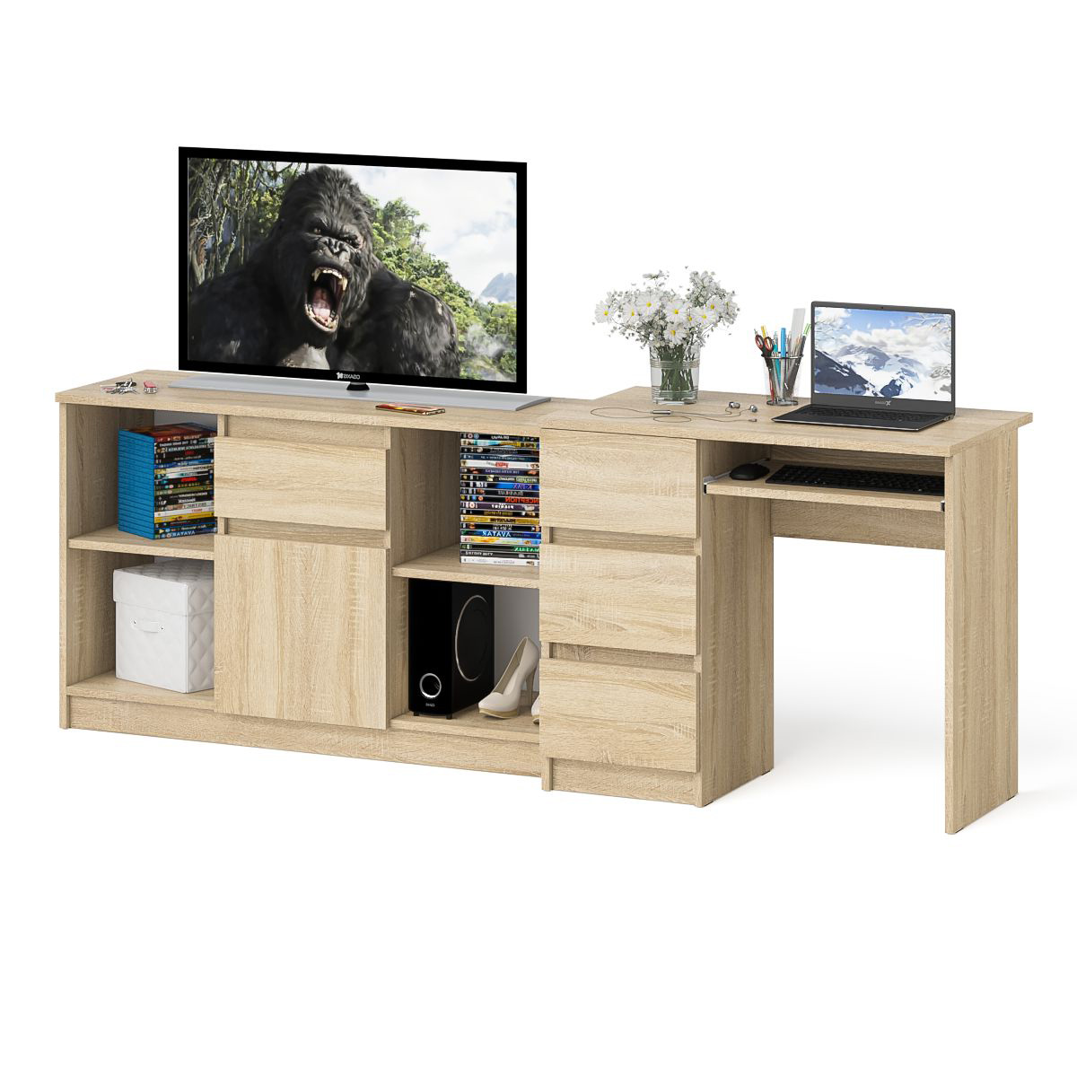 Комплектация включает стол компьютерный Мори МС-6 левый и тумбу ТВ Мори МТВ1204.1. Продуманная конструкция позволяет убрать лишние предметы, тем самым сохраняя единый стиль оформления помещения. Роль ручек выполняют сами фасады. Небольшой Стол Мори МС-6 левый компьютерный с тумбой и выдвижной панелью для клавиатуры. Тумба имеет три выдвижных ящика на роликовых направляющих. Стол компьютерный три ящика Мори МС-6 левый не имеет универсальной сборки - выдвижной ящик расположен слева. Тумба ТВ Мори МТВ1204.1 состоит из двух открытых ниш по бокам и ящика и закрытой нишей по центру. Все ниши имеет полочку по середине. На тумбе достаточно места для размещения телевизора дигональю 47 дюймов. Можно использовать как ТВ тумбу, так и обычную для хранения и размещения Ваших вещей.