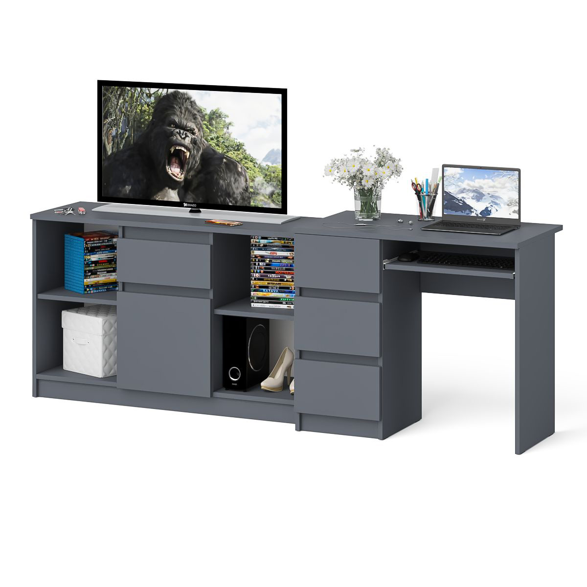 Комплектация включает стол компьютерный Мори МС-6 левый и тумбу ТВ Мори МТВ1204.1. Продуманная конструкция позволяет убрать лишние предметы, тем самым сохраняя единый стиль оформления помещения. Роль ручек выполняют сами фасады. Небольшой Стол Мори МС-6 левый компьютерный с тумбой и выдвижной панелью для клавиатуры. Тумба имеет три выдвижных ящика на роликовых направляющих. Стол компьютерный три ящика Мори МС-6 левый не имеет универсальной сборки - выдвижной ящик расположен слева. Тумба ТВ Мори МТВ1204.1 состоит из двух открытых ниш по бокам и ящика и закрытой нишей по центру. Все ниши имеет полочку по середине. На тумбе достаточно места для размещения телевизора дигональю 47 дюймов. Можно использовать как ТВ тумбу, так и обычную для хранения и размещения Ваших вещей.