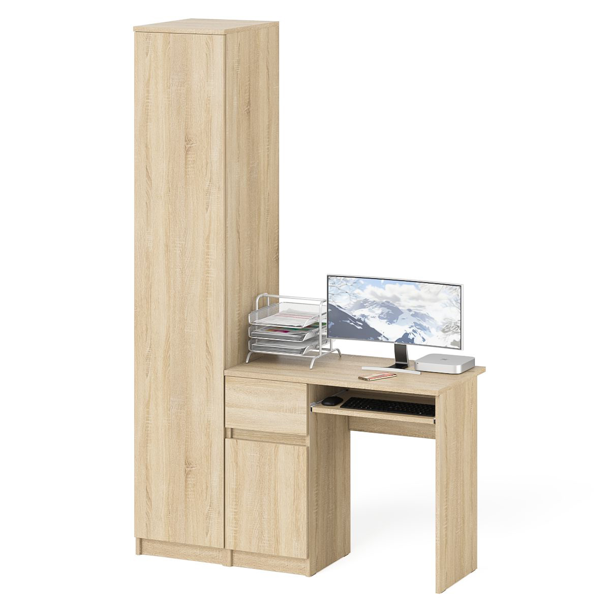 Комплектация включает стол компьютерный Мори МС-1 левый и пенал с дверкой Мори МШ400.1. Продуманная конструкция позволяет убрать лишние предметы, тем самым сохраняя единый стиль оформления помещения. Роль ручек выполняют сами фасады. Небольшой стол компьютерный Мори МС-1 левый с тумбой и выдвижной панелью для клавиатуры. Тумба имеет нишу с полочкой за распашной дверкой и выдвижной ящик на роликовых направляющих. Стол компьютерный Мори МС-1 левый не имеет универсальной сборки - выдвижной ящик расположен слева. Узкий высокий пенал Мори МШ400.1 за распашной дверкой расположены пять полок. Универсальная сборка - сторону открывания двери Вы определяете при сборке.