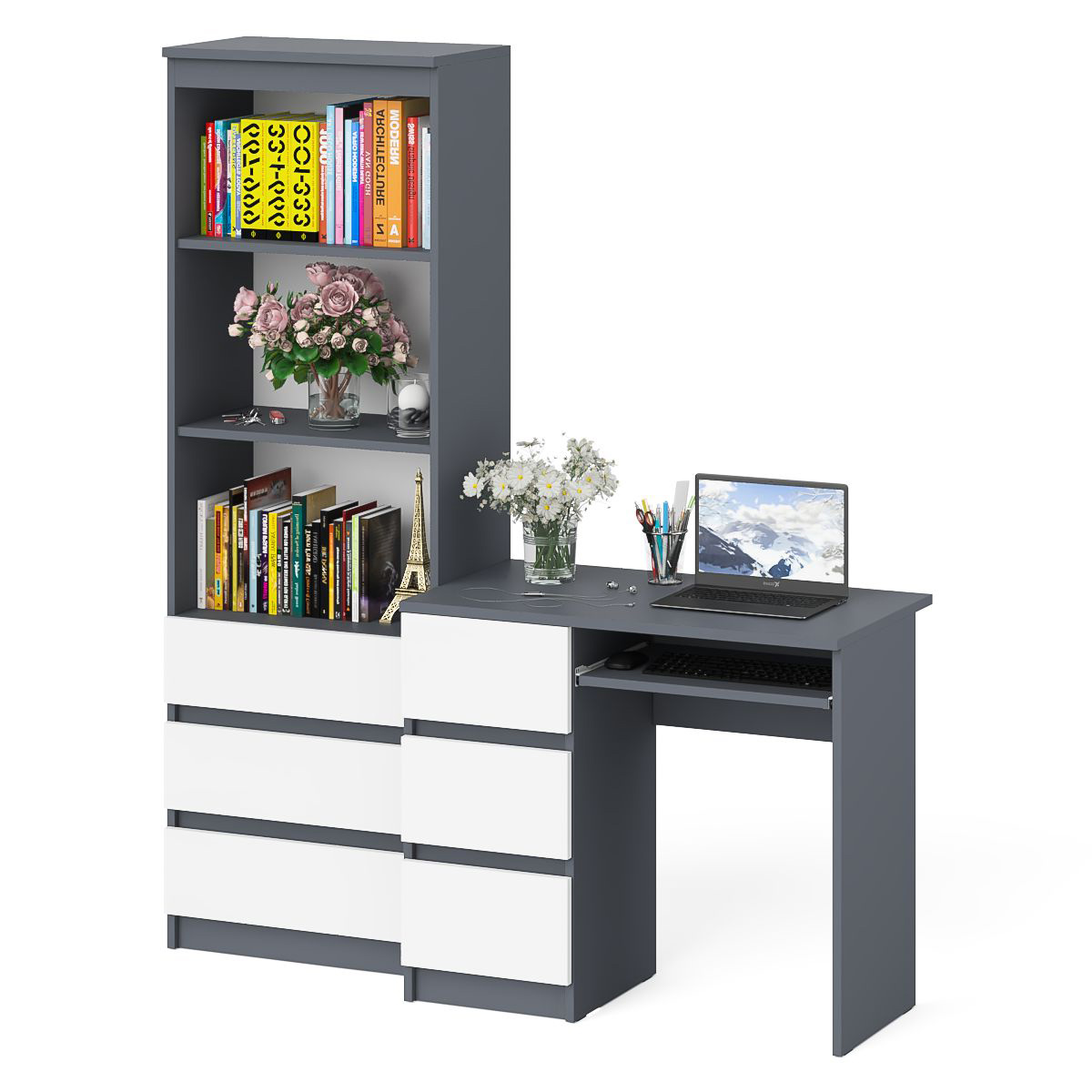 Отзывы о Столплит Стол компьютерный с тумбой с ящиками слева и стеллаж-комод МСТ600.3 Мори Графит/Белый