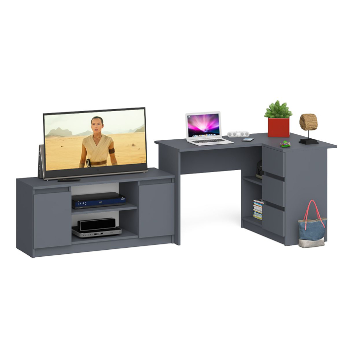 Комплектация включает стол компьютерный Мори МС-16 правый и тумбу ТВ Мори МТВ1200.1. Продуманная конструкция позволяет убрать лишние предметы, тем самым сохраняя единый стиль оформления помещения. Роль ручек выполняют сами фасады. Угловой компьютерный стол Мори МС-16 правый - конструктивно тумба со столешницей образуют угол. Тумба имеет 3 выдвижных ящика и нишу с полкой по середине. Угловой компьютерный стол Мори МС-16 правый не универсален при сборке - тумба с ящиками располагается справа. Тумба ТВ Мори МТВ1200.1 состоит из открытой ниши по центру и двумя закрытыми распашными дверками по краям. Все ниши имеет полочку по середине. На тумбе достаточно места для размещения телевизора дигональю 47 дюймов. Можно использовать как ТВ тумбу, так и обычную для хранения и размещения Ваших вещей.