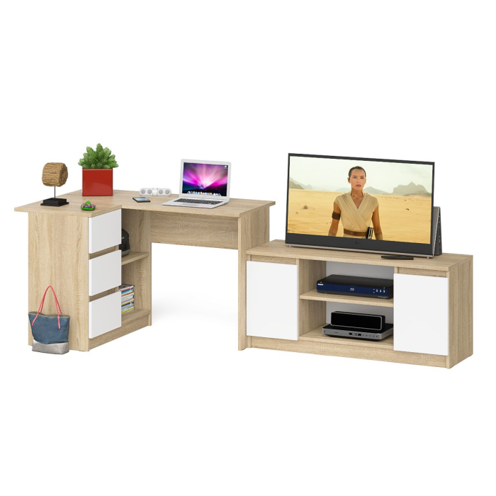 Комплектация включает стол компьютерный Мори МС-16 левый и тумбу ТВ Мори МТВ1200.1. Продуманная конструкция позволяет убрать лишние предметы, тем самым сохраняя единый стиль оформления помещения. Роль ручек выполняют сами фасады. Угловой компьютерный стол Мори МС-16 левый - конструктивно тумба со столешницей образуют угол. Тумба имеет 3 выдвижных ящика и нишу с полкой по середине. Угловой компьютерный стол Мори МС-16 левый не универсален при сборке - тумба с ящиками располагается слева. Тумба ТВ Мори МТВ1200.1 состоит из открытой ниши по центру и двумя закрытыми распашными дверками по краям. Все ниши имеет полочку по середине. На тумбе достаточно места для размещения телевизора дигональю 47 дюймов. Можно использовать как ТВ тумбу, так и обычную для хранения и размещения Ваших вещей.