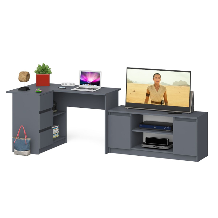 Комплектация включает стол компьютерный Мори МС-16 левый и тумбу ТВ Мори МТВ1200.1. Продуманная конструкция позволяет убрать лишние предметы, тем самым сохраняя единый стиль оформления помещения. Роль ручек выполняют сами фасады. Угловой компьютерный стол Мори МС-16 левый - конструктивно тумба со столешницей образуют угол. Тумба имеет 3 выдвижных ящика и нишу с полкой по середине. Угловой компьютерный стол Мори МС-16 левый не универсален при сборке - тумба с ящиками располагается слева. Тумба ТВ Мори МТВ1200.1 состоит из открытой ниши по центру и двумя закрытыми распашными дверками по краям. Все ниши имеет полочку по середине. На тумбе достаточно места для размещения телевизора дигональю 47 дюймов. Можно использовать как ТВ тумбу, так и обычную для хранения и размещения Ваших вещей.