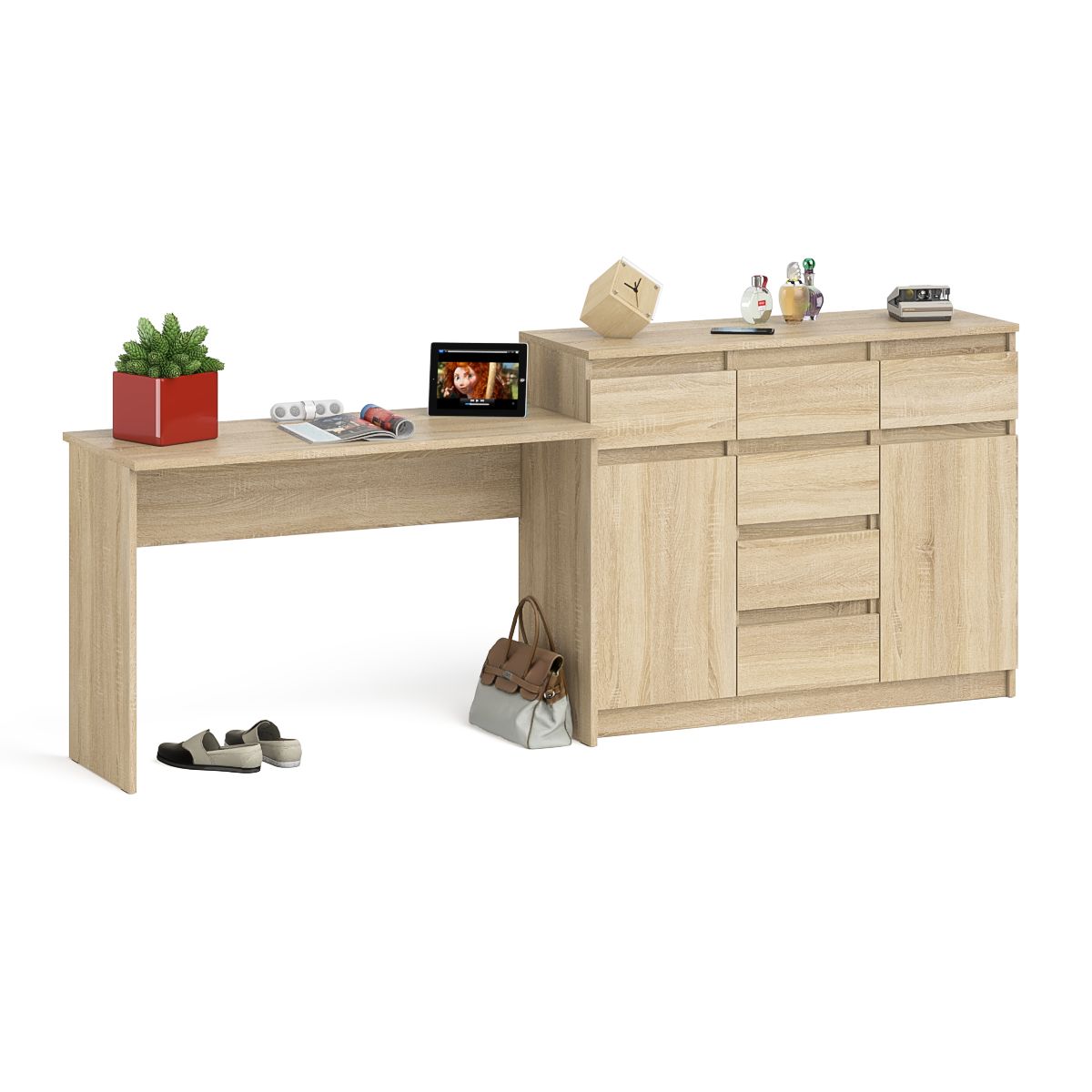 Комплектация включает стол письменный Мори МСП1200.1 и комод Мори МК1200.4. Продуманная конструкция позволяет убрать лишние предметы, тем самым сохраняя единый стиль оформления помещения. Роль ручек выполняют сами фасады. Стол письменный Мори МСП1200.1 - простой аккуратный стол без тумб и ящиков - минималистичный дизайн и доступная цена. Столещница размером 120х50 см. вместит все необходимые принадлежности для работы. По бокам располагаются две опоры из ЛДСП выполняющие роль ножек. С задней стороны стола имеется царга - верхняя соединительная планка между ножками. Комод Мори МК1200.4 оборудован шестью выдвижными ящиками и двумя закрытыми отделениями с полками. В верхней части комода расположены три ящика, под ними в центре отделение с ещё тремя ящиками и по бокам отделения с дверками.