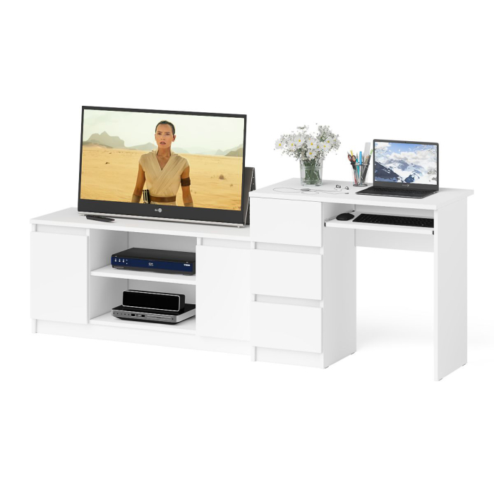 Комплектация включает стол компьютерный Мори МС-6 левый и тумбу ТВ Мори МТВ1200.1. Продуманная конструкция позволяет убрать лишние предметы, тем самым сохраняя единый стиль оформления помещения. Отсутствие ручек главное преимущество данной модели. Роль ручек выполняют сами фасады. Небольшой Стол Мори МС-6 левый компьютерный с тумбой и выдвижной панелью для клавиатуры. Тумба имеет три выдвижных ящика на роликовых направляющих. Стол компьютерный три ящика Мори МС-6 левый не имеет универсальной сборки - выдвижные ящики расположены слева. Тумба ТВ Мори МТВ1200.1 состоит из открытой ниши по центру и двумя закрытыми распашными дверками по краям. Все ниши имеет полочку по середине. На тумбе достаточно места для размещения телевизора диагональю 47 дюймов. Можно использовать как ТВ тумбу, так и обычную для хранения и размещения Ваших вещей.