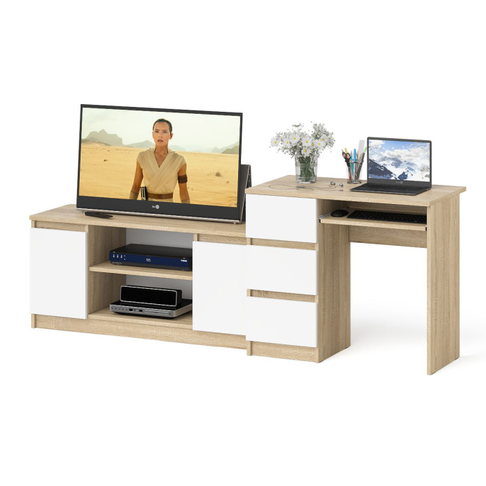 Комплектация включает стол компьютерный Мори МС-6 левый и тумбу ТВ Мори МТВ1200.1. Продуманная конструкция позволяет убрать лишние предметы, тем самым сохраняя единый стиль оформления помещения. Отсутствие ручек главное преимущество данной модели. Роль ручек выполняют сами фасады. Небольшой Стол Мори МС-6 левый компьютерный с тумбой и выдвижной панелью для клавиатуры. Тумба имеет три выдвижных ящика на роликовых направляющих. Стол компьютерный три ящика Мори МС-6 левый не имеет универсальной сборки - выдвижные ящики расположены слева. Тумба ТВ Мори МТВ1200.1 состоит из открытой ниши по центру и двумя закрытыми распашными дверками по краям. Все ниши имеет полочку по середине. На тумбе достаточно места для размещения телевизора диагональю 47 дюймов. Можно использовать как ТВ тумбу, так и обычную для хранения и размещения Ваших вещей.