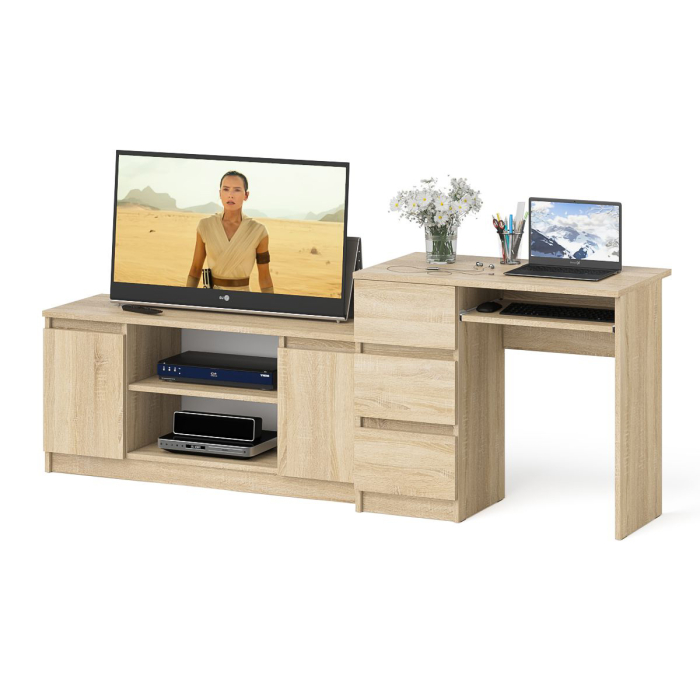 Комплектация включает стол компьютерный Мори МС-6 левый и тумбу ТВ Мори МТВ1200.1. Продуманная конструкция позволяет убрать лишние предметы, тем самым сохраняя единый стиль оформления помещения. Отсутствие ручек главное преимущество данной модели. Роль ручек выполняют сами фасады. Небольшой Стол Мори МС-6 левый компьютерный с тумбой и выдвижной панелью для клавиатуры. Тумба имеет три выдвижных ящика на роликовых направляющих. Стол компьютерный три ящика Мори МС-6 левый не имеет универсальной сборки - выдвижные ящики расположены слева. Тумба ТВ Мори МТВ1200.1 состоит из открытой ниши по центру и двумя закрытыми распашными дверками по краям. Все ниши имеет полочку по середине. На тумбе достаточно места для размещения телевизора диагональю 47 дюймов. Можно использовать как ТВ тумбу, так и обычную для хранения и размещения Ваших вещей.